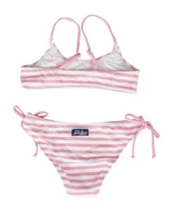 Costume multicolor intero. È decorato con rouches fucsia laterale a contrasto e unicorni all-over.
