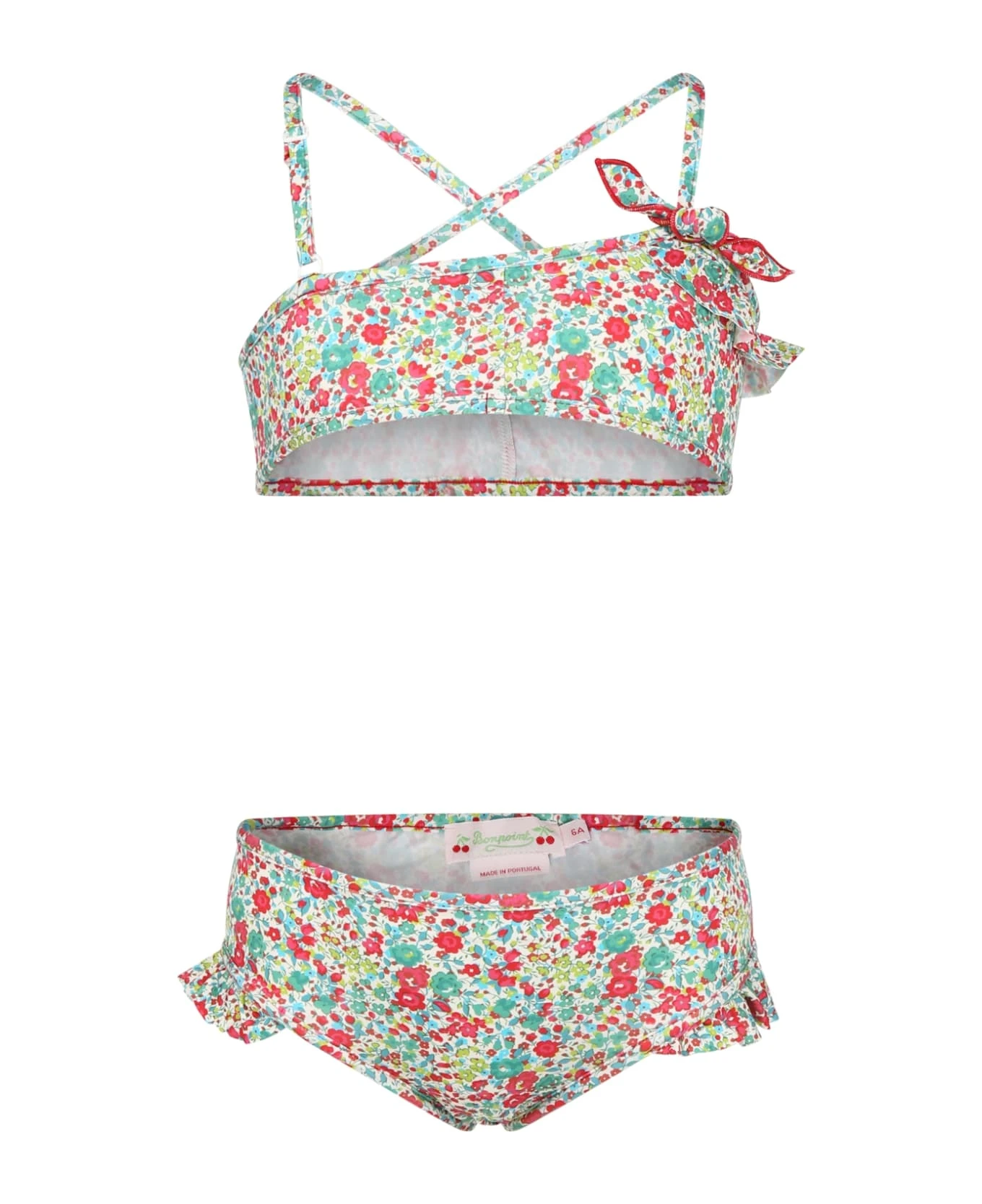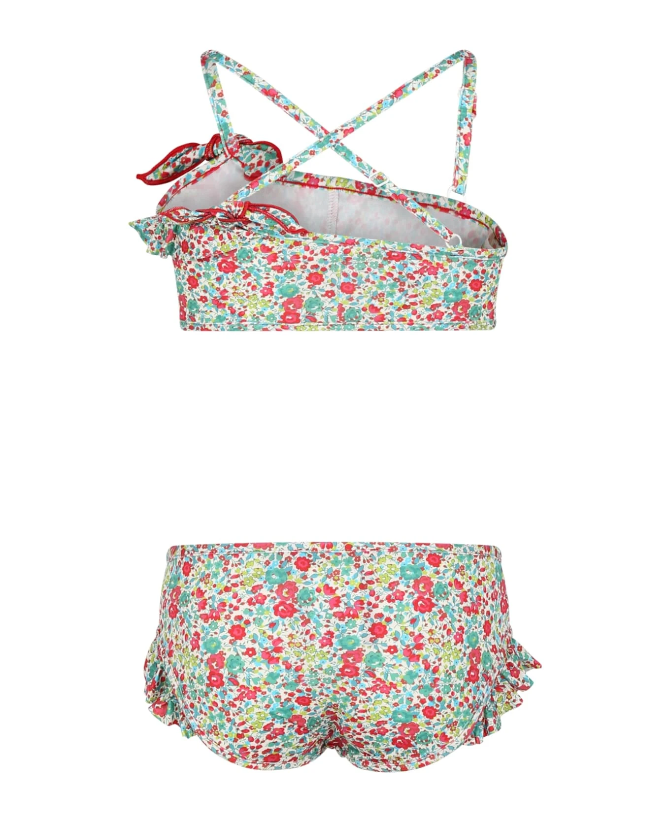 Bikini multicolore composé d’un haut à bretelles réglables et croisé dans le dos et d’un bas à volants. Il est agrémenté avec de volants, de n uds et de cerises nacrées iconiques sur le dessus, imprimé liberty all-over.