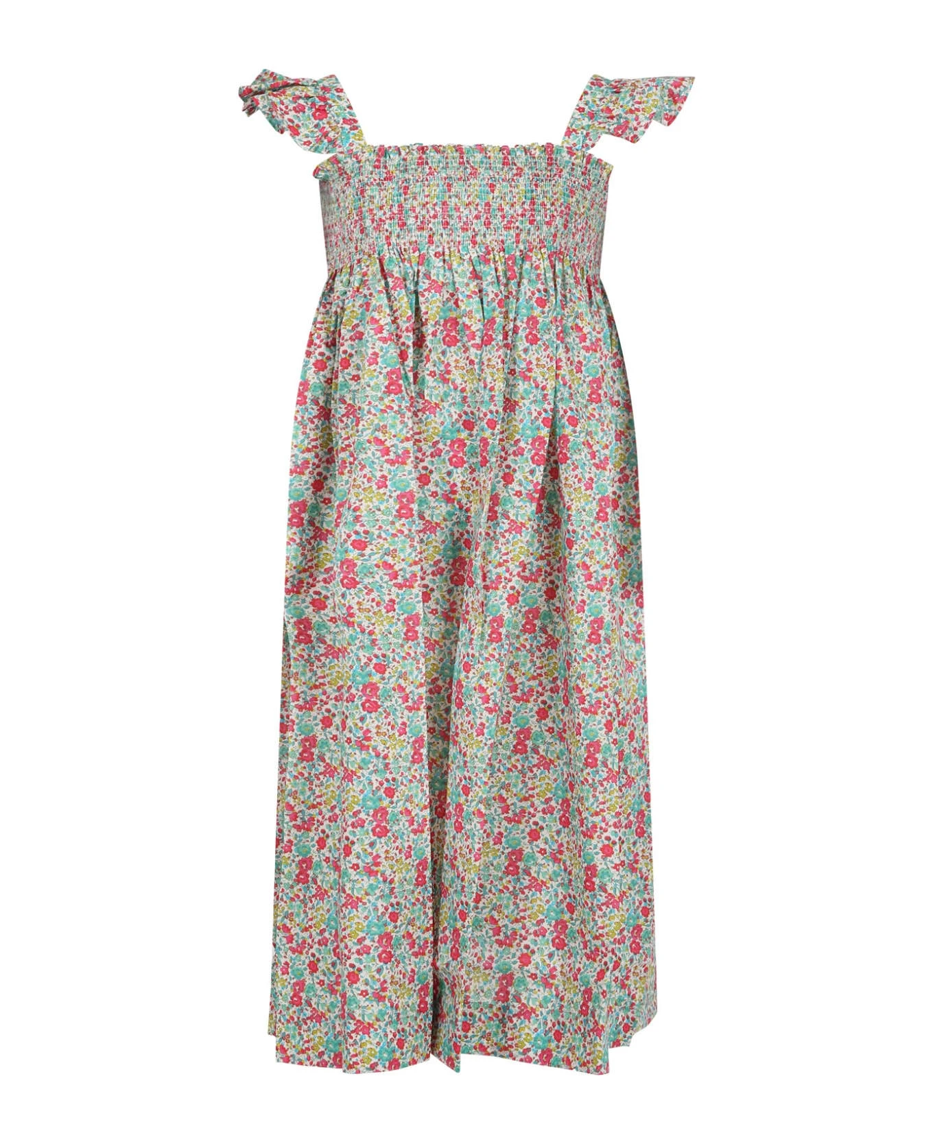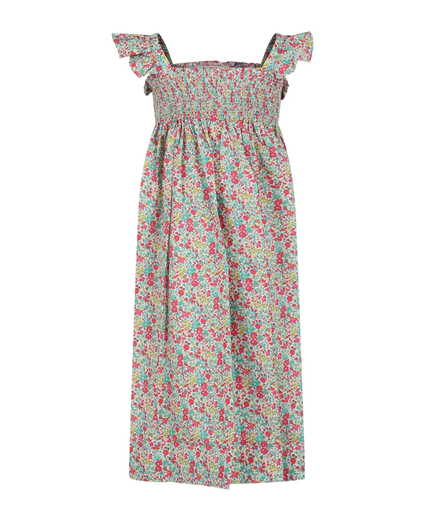 Multicolor sleeveless dress, in cotton, with shoulder pads, elasticated upper part in smocked stitch. It is embellished with ruffles on the shoulder straps and an all-over liberty print.