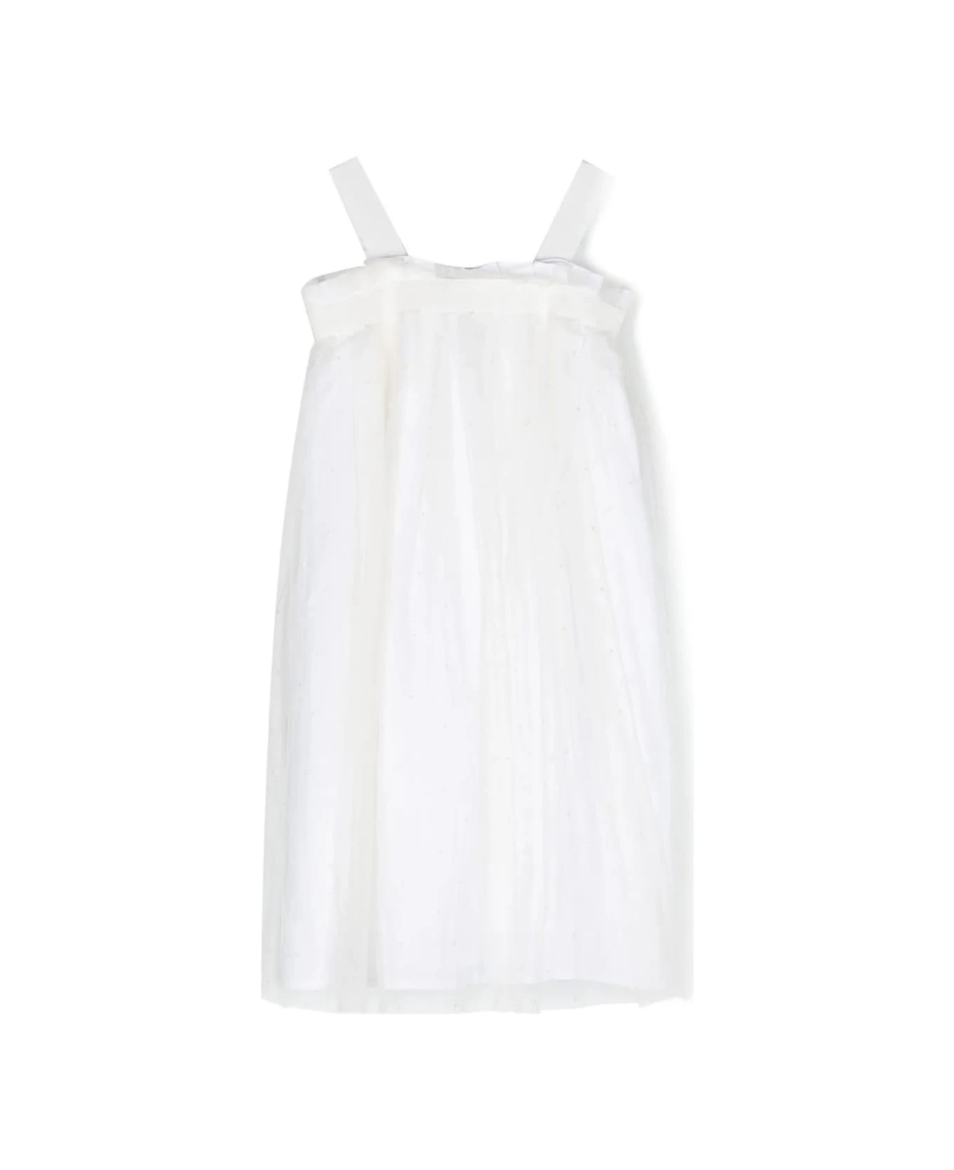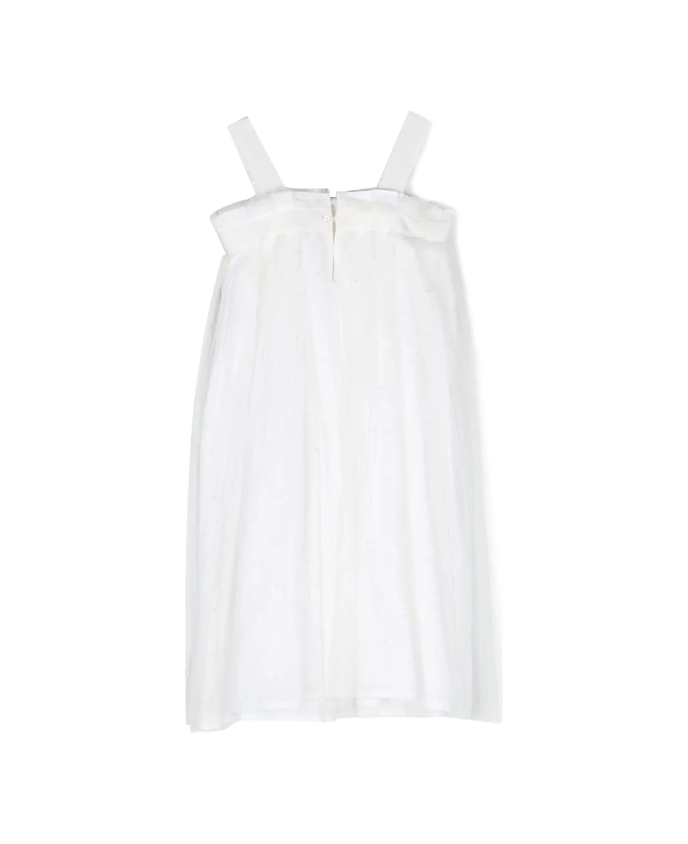 Etincelle dress by Bonpoint made of a delicate natural white fabric with fluid draping and delicate pleats at the top. The model has a slightly flared cut and fastens with a button at the back.