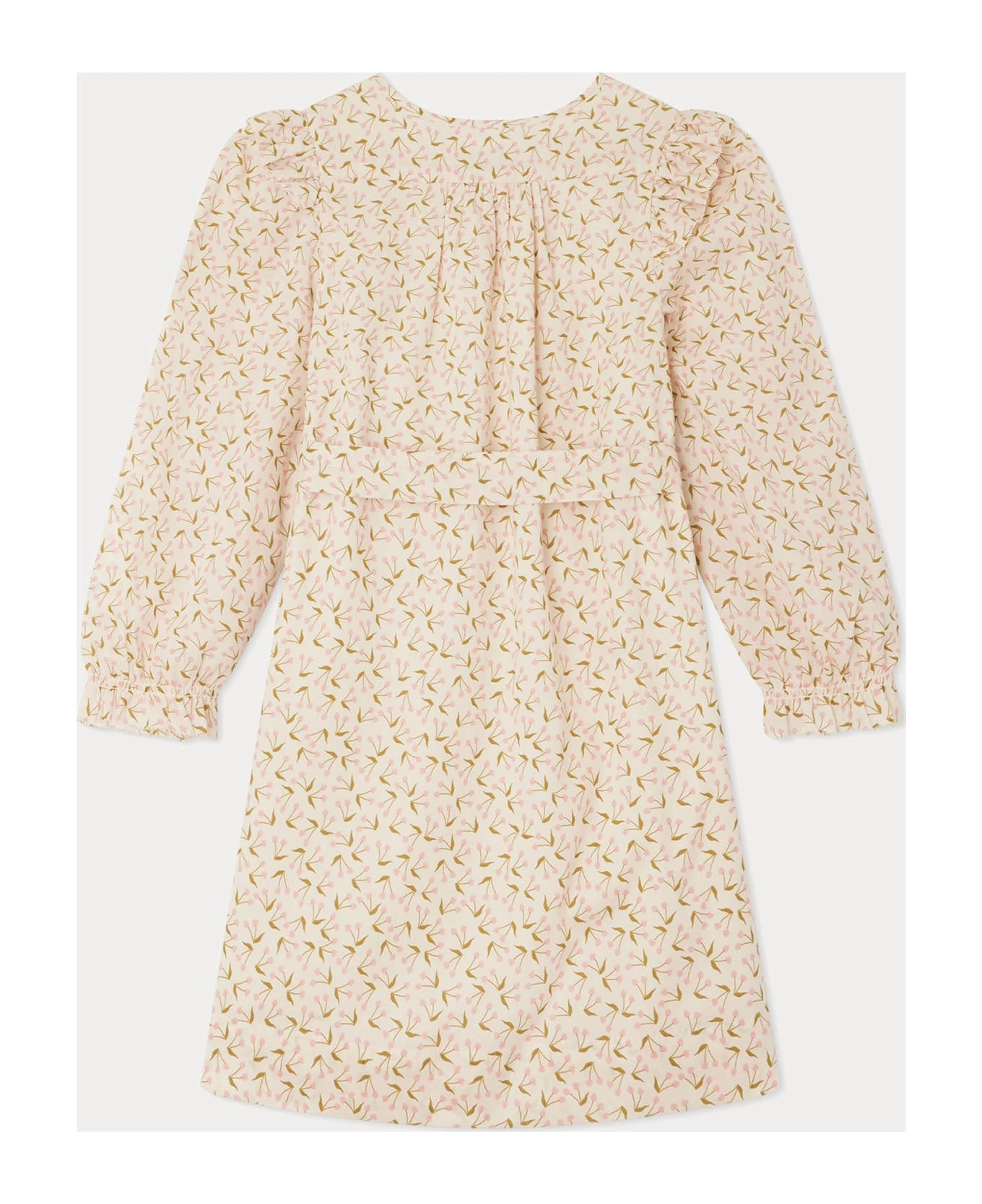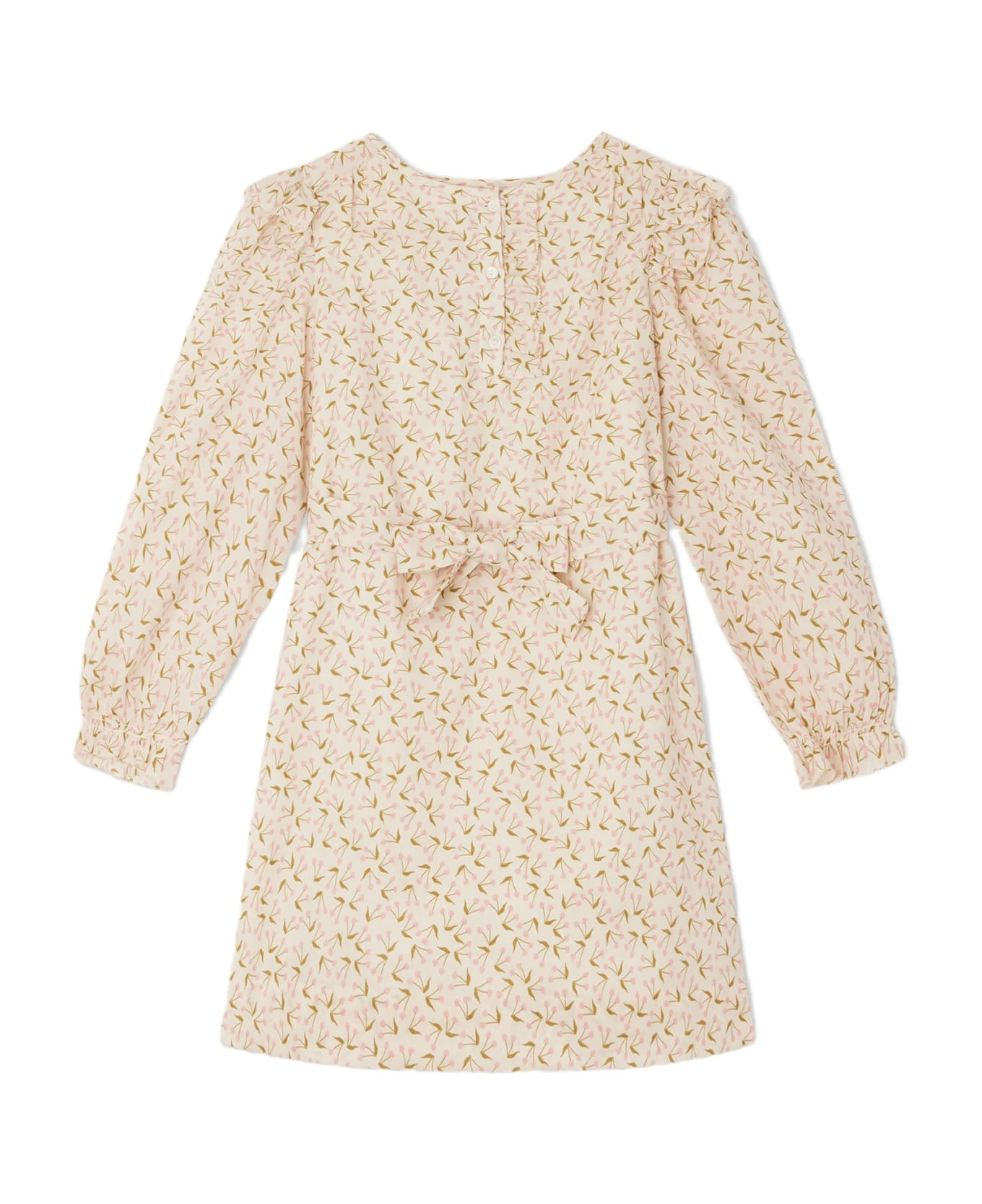 Cotton dress, round neckline, all-over print, long sleeves, button closure on the back, bow at the waist