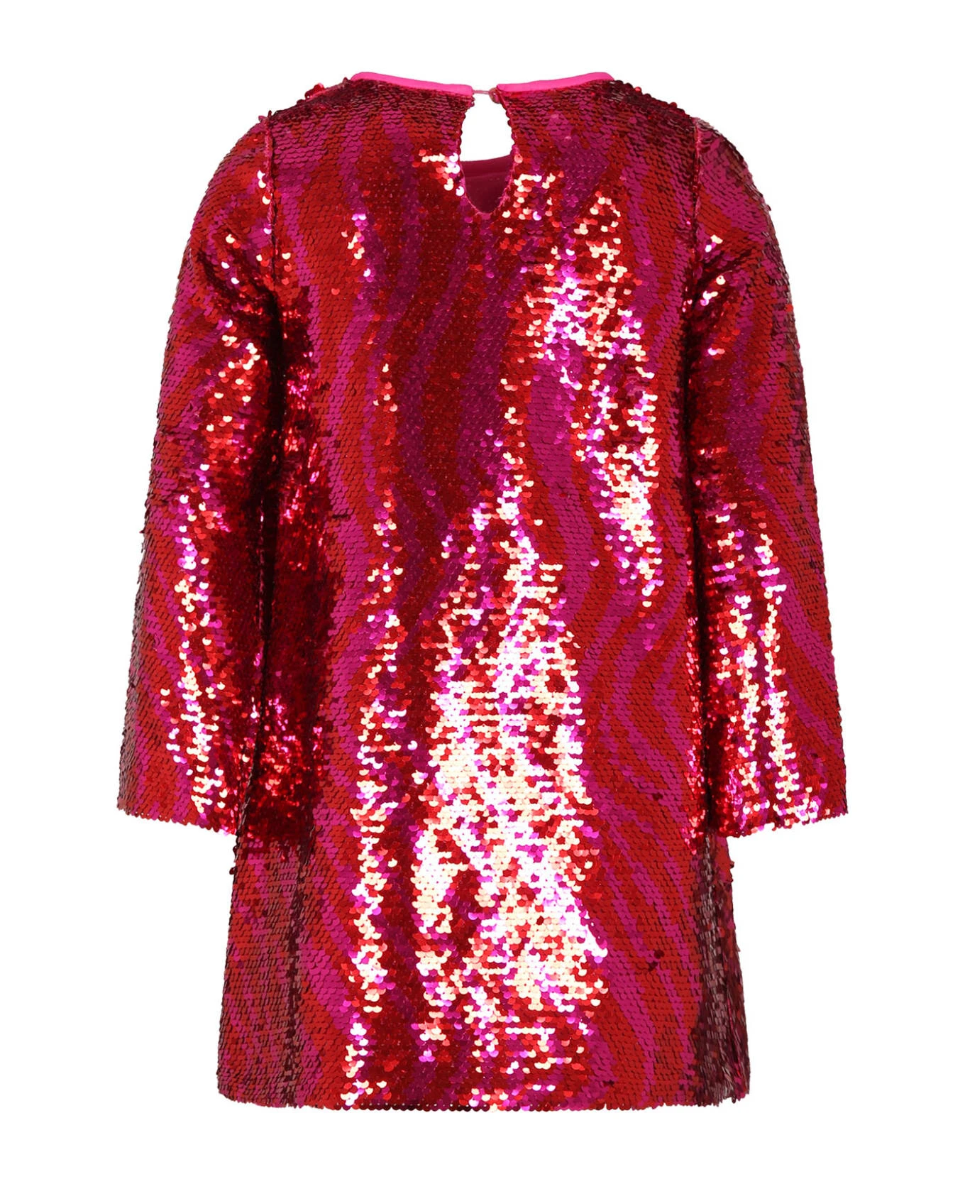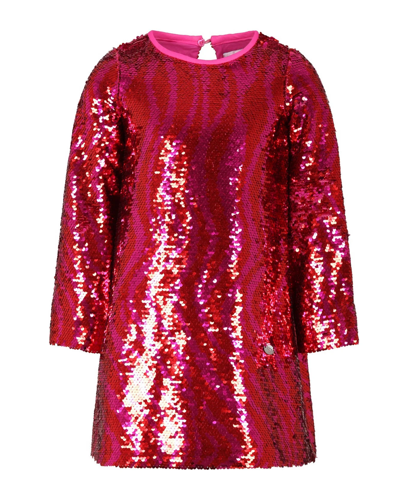 Red dress, with long sleeves, round neckline, button closure on the back. It is embellished with all-over sequins and with a metal logo on the bottom.