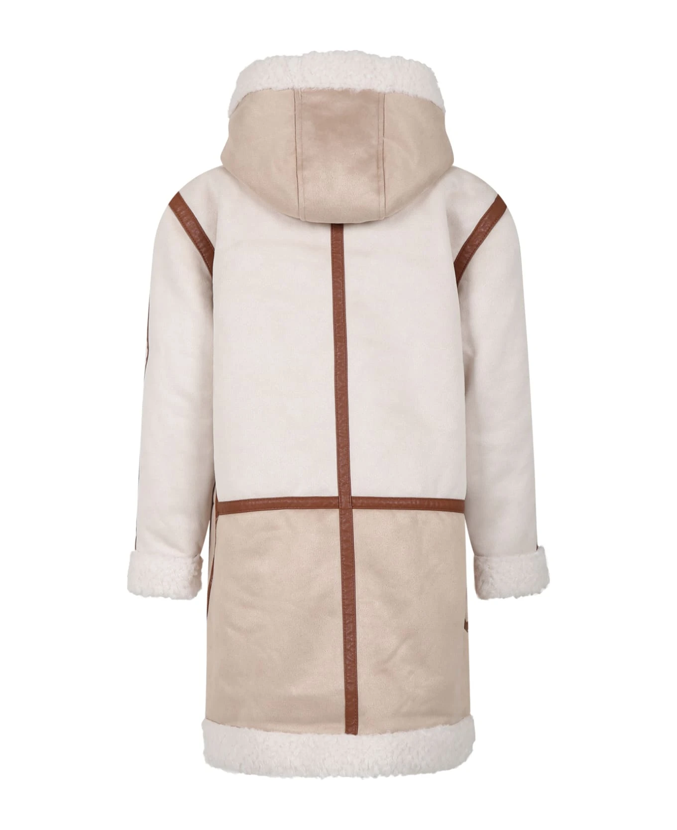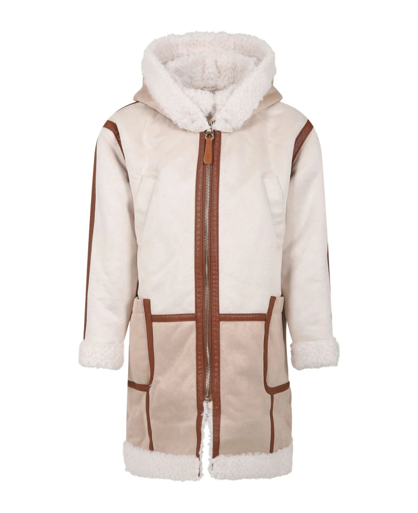 Beige suede coat, long sleeves, with removable hood, zip closure on the front, ivory shearling inside, side pockets, welt pockets on the chest and brown leather profiles.