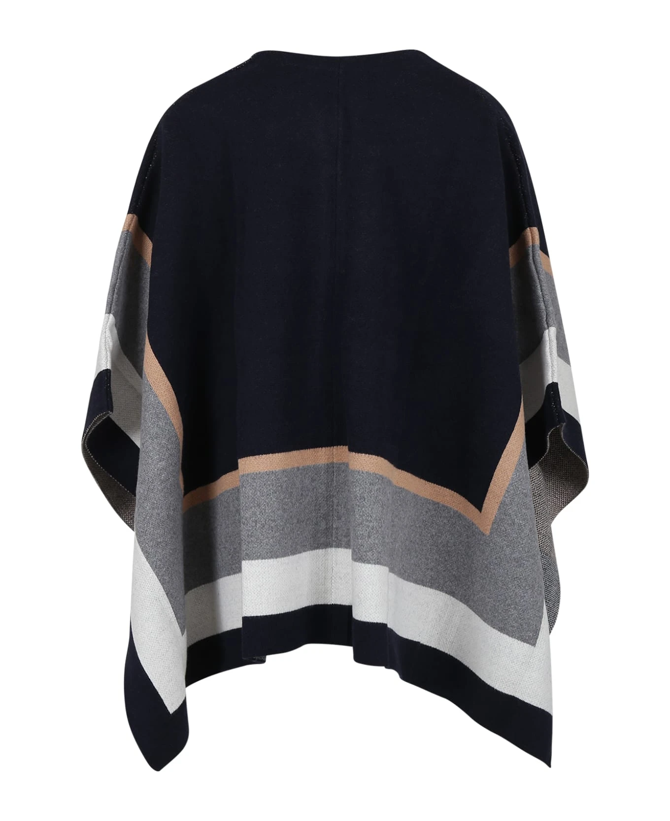 Blue cape in organic cotton and wool, front closure with adjustable buckle, grey and brown details. It is embellished with logo on the side.