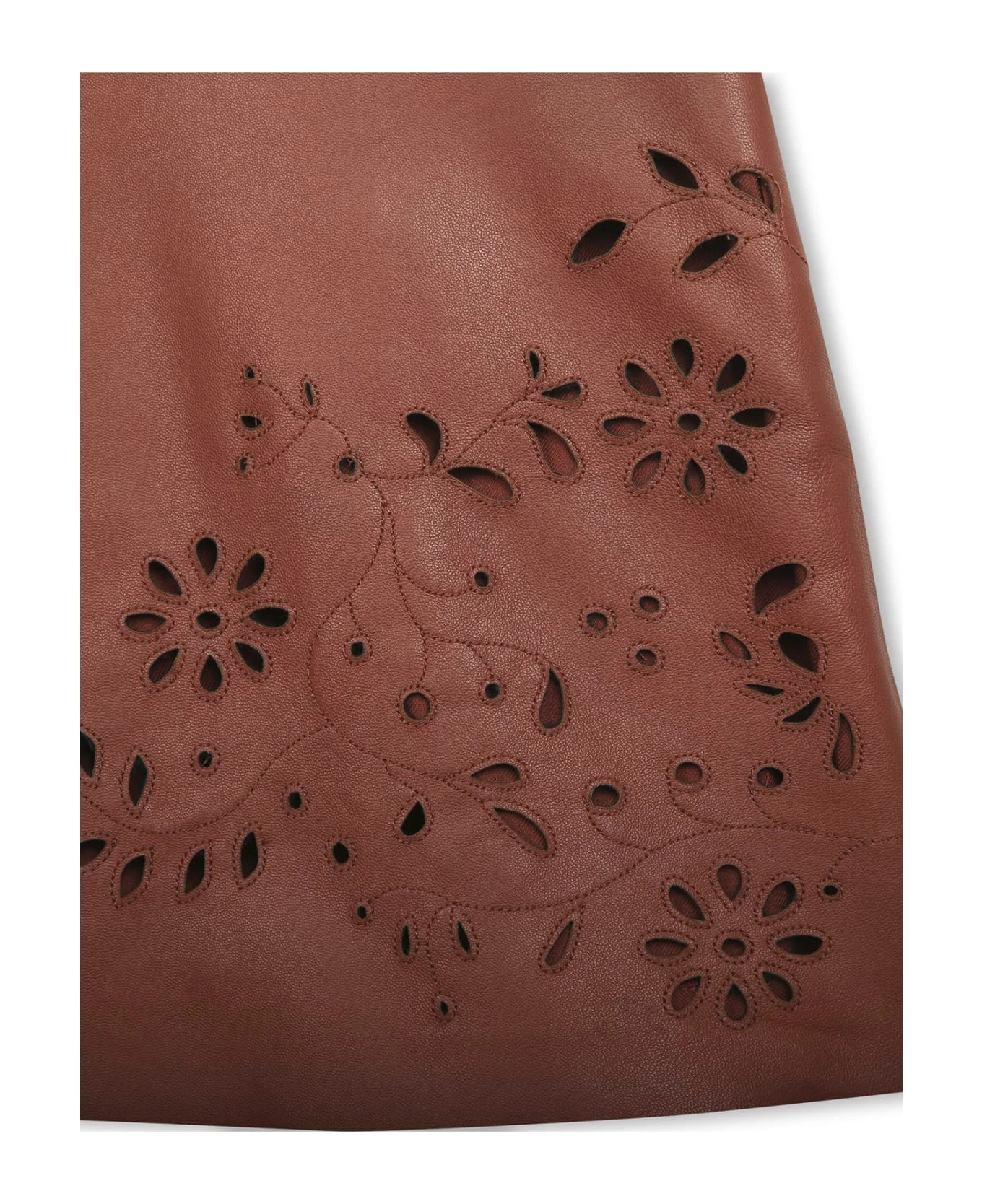 Chloé Kids skirt made of brick red leather and embellished with tone-on-tone floral carving embroidery. Side zip fastening. Above-the-knee length.