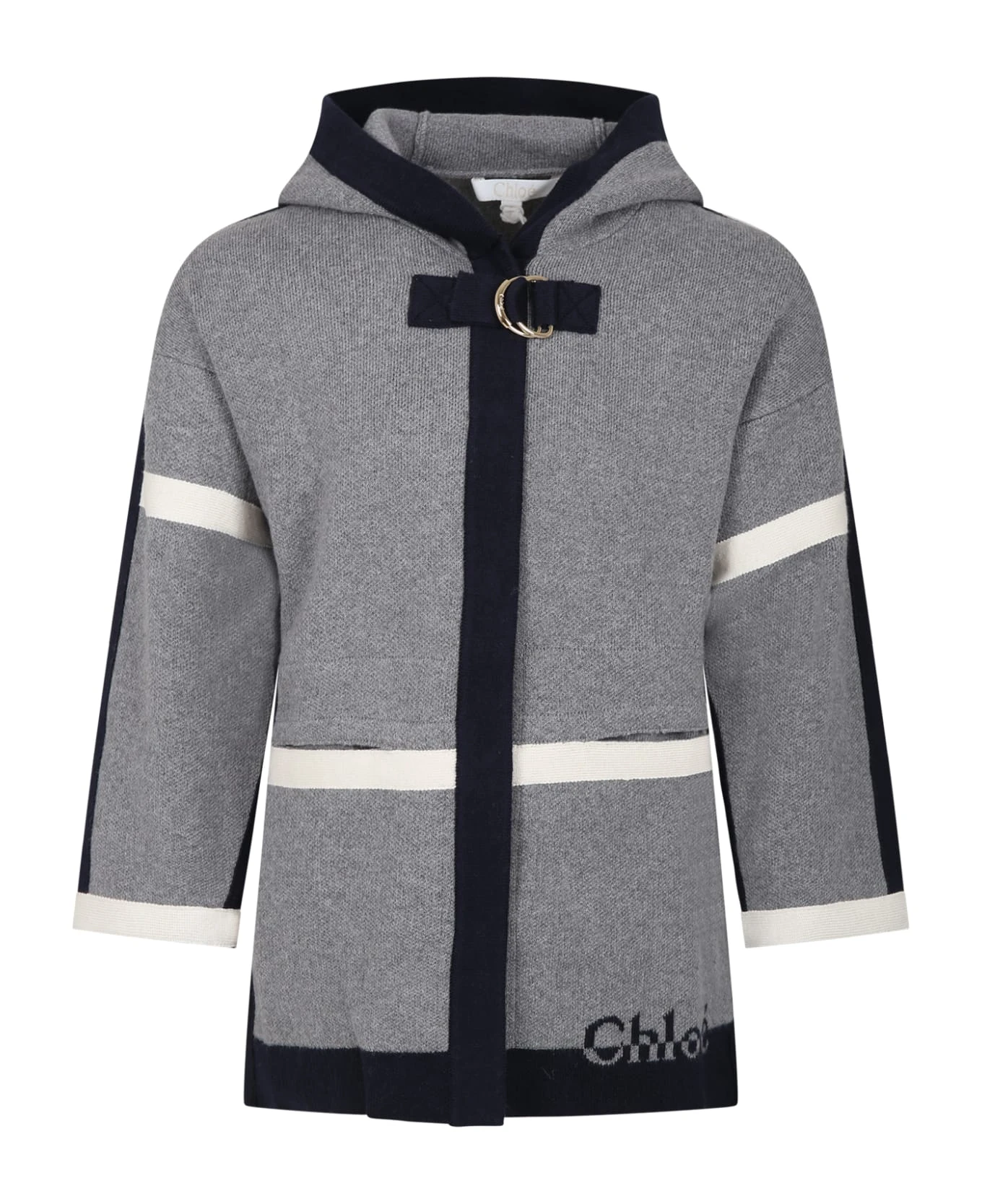 Grey knitted coat with hood, side pockets, hidden popper fastening and gold-tone D-ring at the neck; it is embellished with blue and ivory trims and blue inlaid logo on the side.