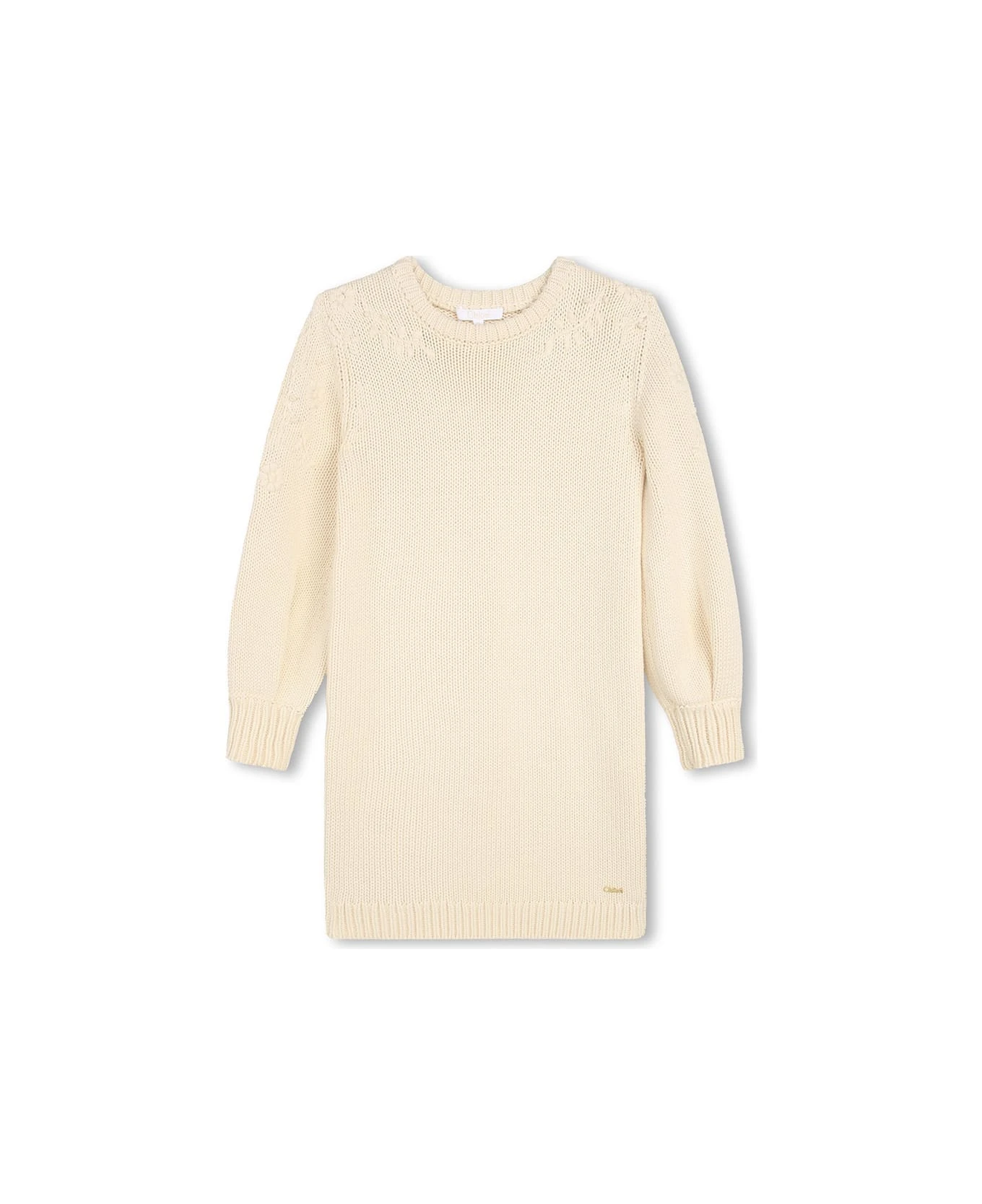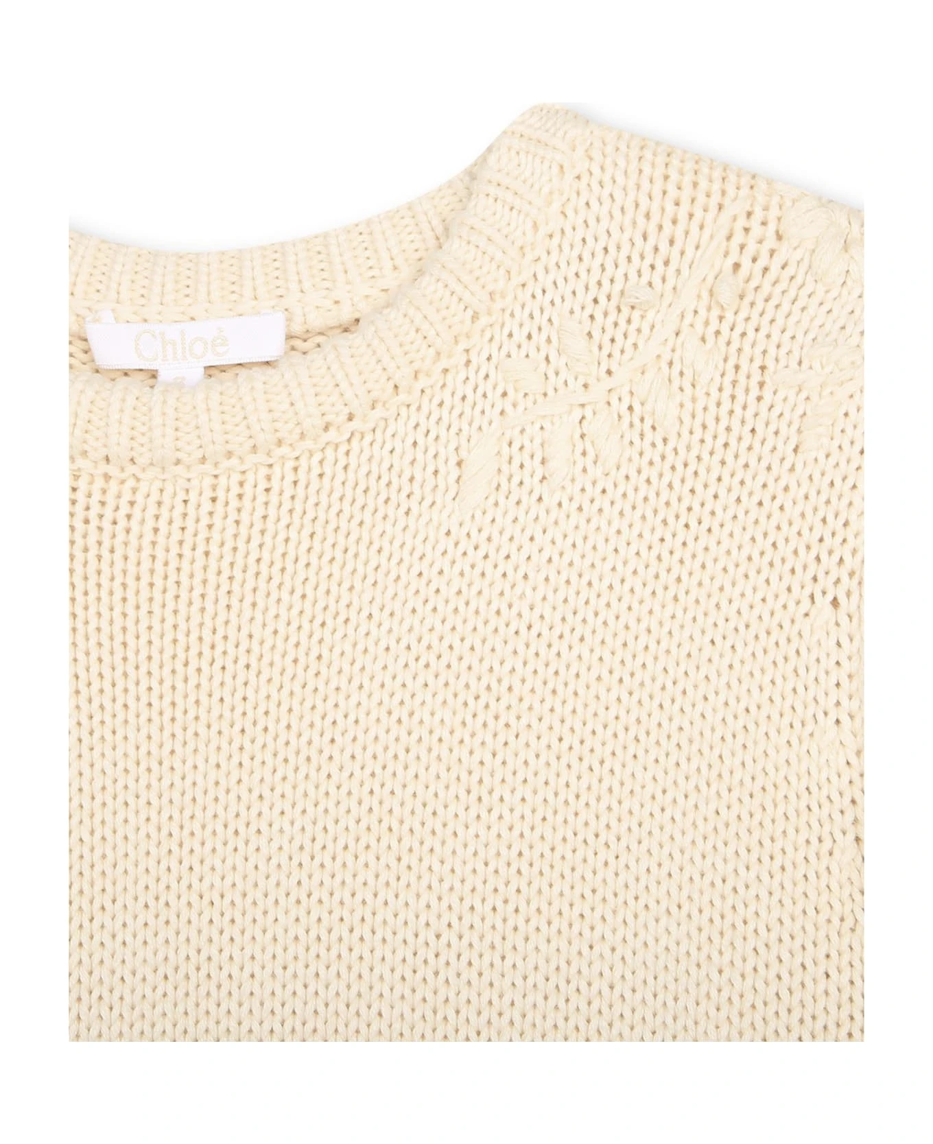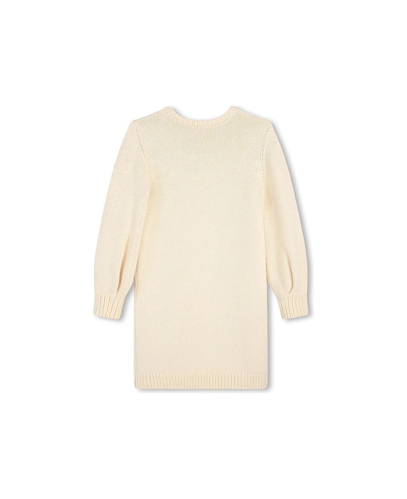 Chloé Kids dress made from ivory knitted wool and cotton blend yarn and embellished on the shoulders and sleeves with tone-on-tone floral embroidery. It features a round neckline, long sleeves, a ribbed trim and a logo applique on the front hem.