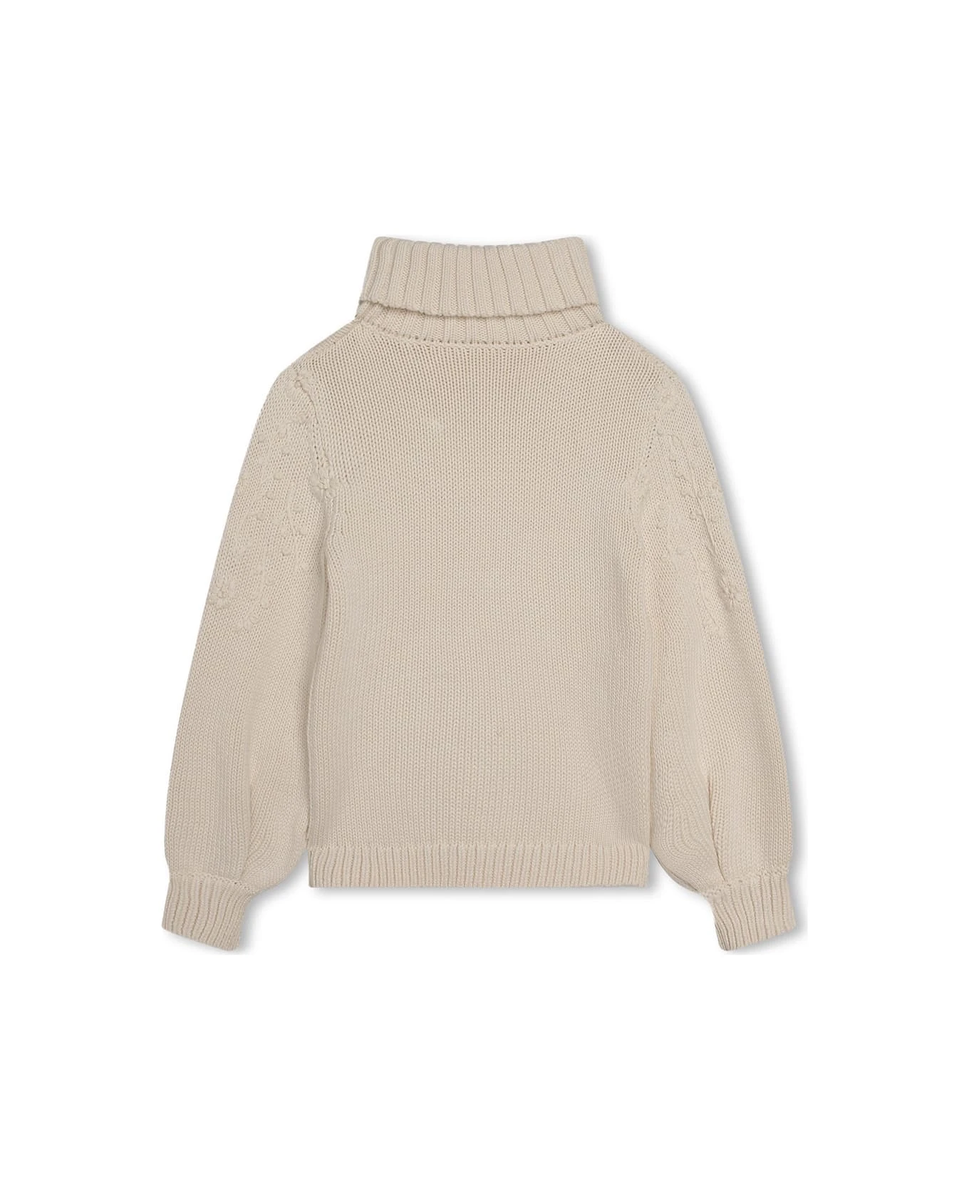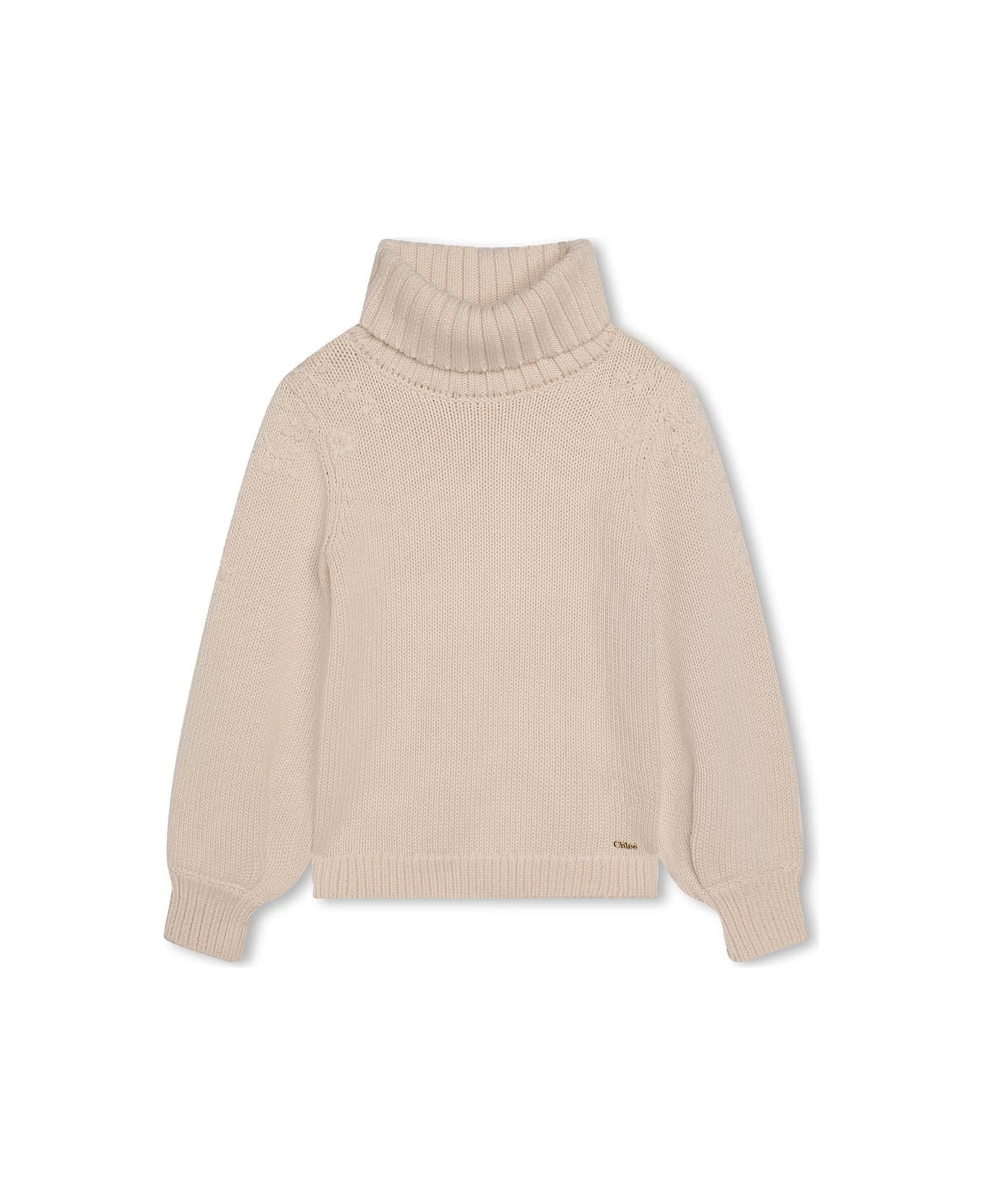 Ivory turtleneck sweater by Chloé Kids made of wool-cotton blend yarn and finished with tonal floral embroidery on the shoulders. Ribbed elastic trim and gold logo applique on the front hem.