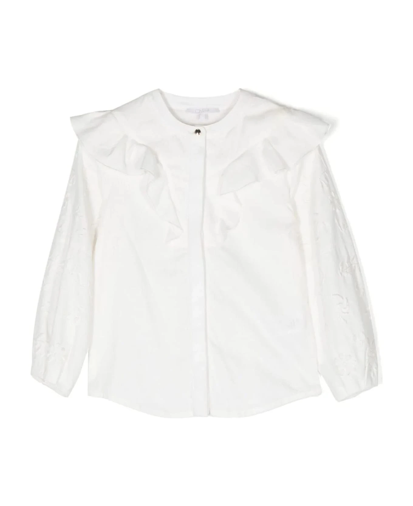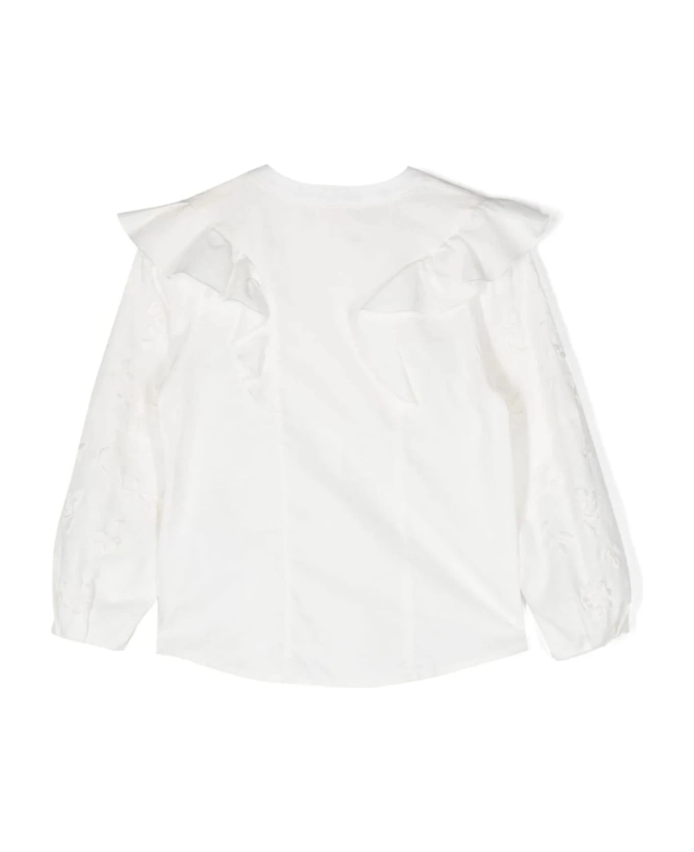 Milk white cotton blouse, ruffled detailing, embroidered design, crew neck, front button fastening, long sleeves, straight hem