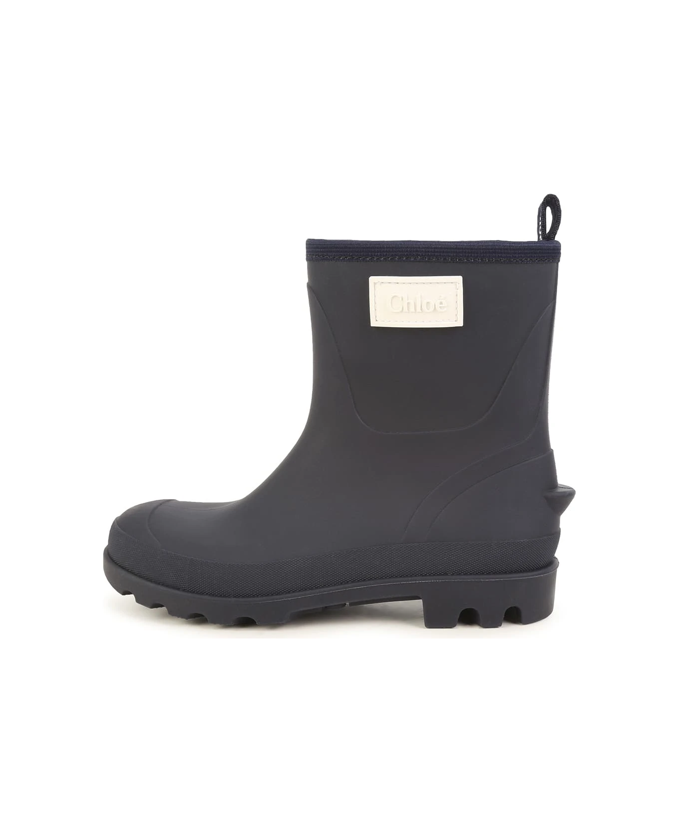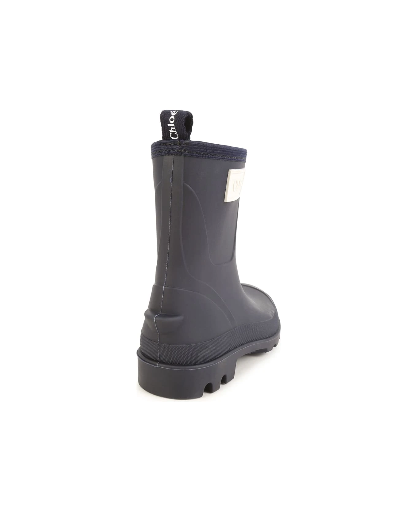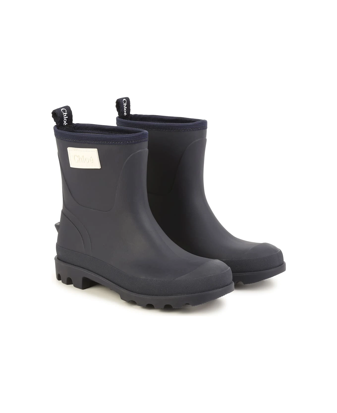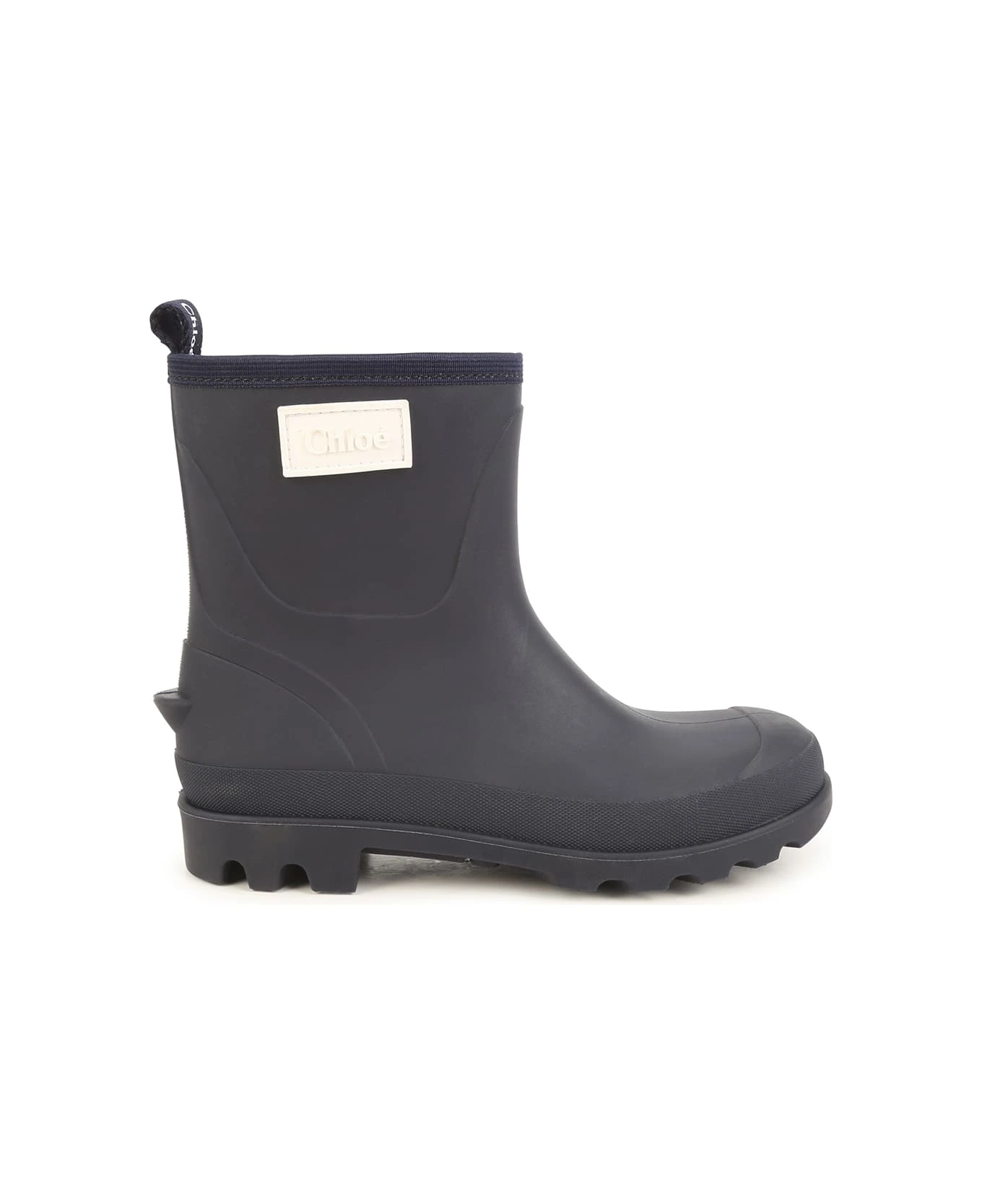 Chlo ids ankle boots made of navy blue rubber and characterised by a round toe, back puller and contrasting logo patch applied on the outer side.