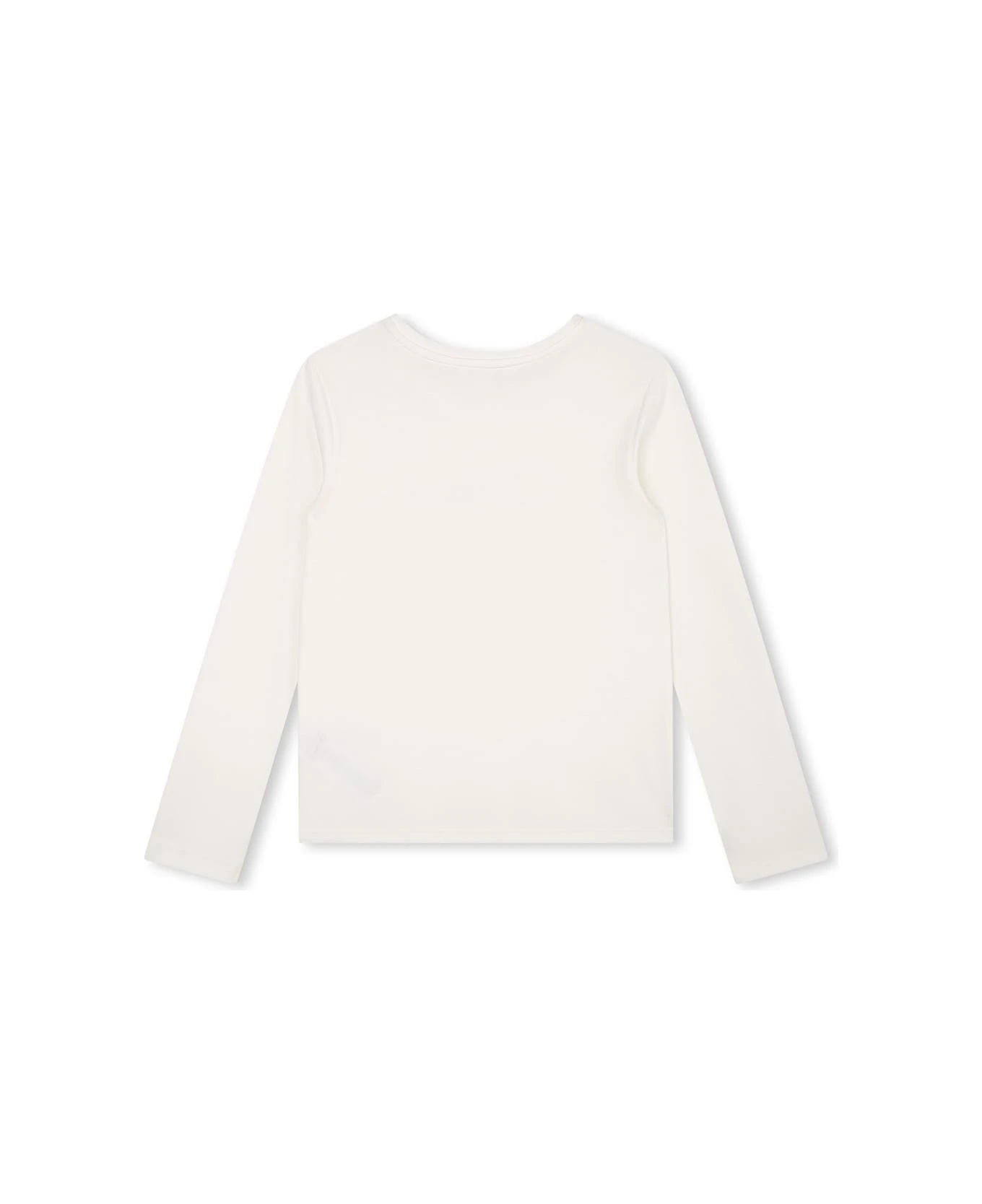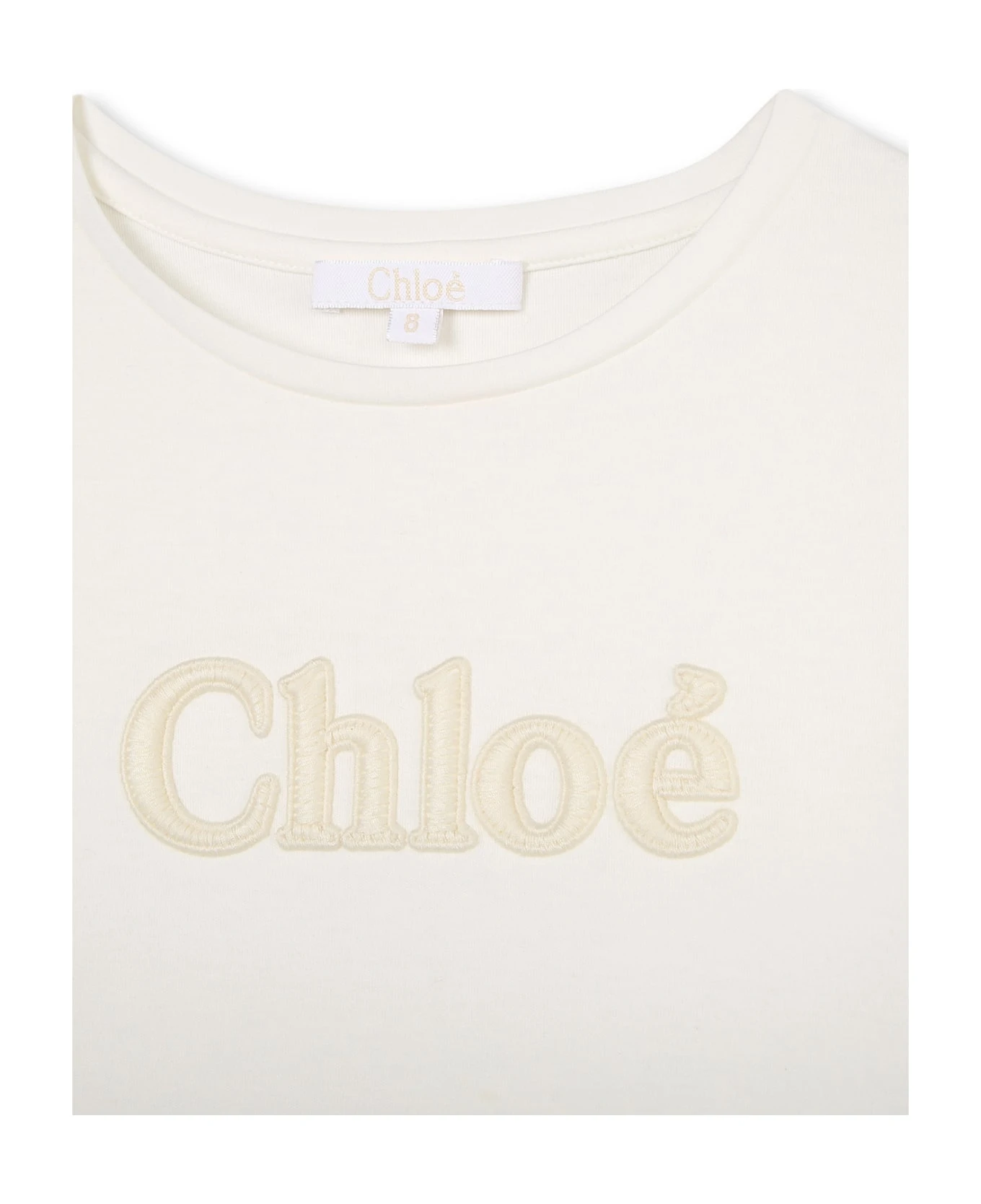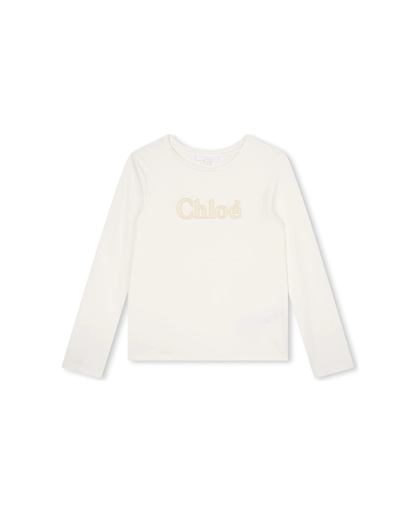 Chloé Kids t-shirt made of white organic cotton and featuring a round neckline, long sleeves and an embroidered Chloé logo on the chest.
