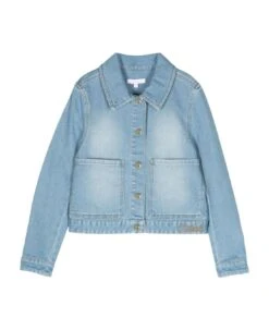 Denim jacket girl Chloé Kids. Fading design, contrast stitching, embroidered logo hem, classic collar, front button fastening, long sleeves, button hems and two front patch pockets. Cotton 88%, Polyester 11%, Spandex/Elastam 1%