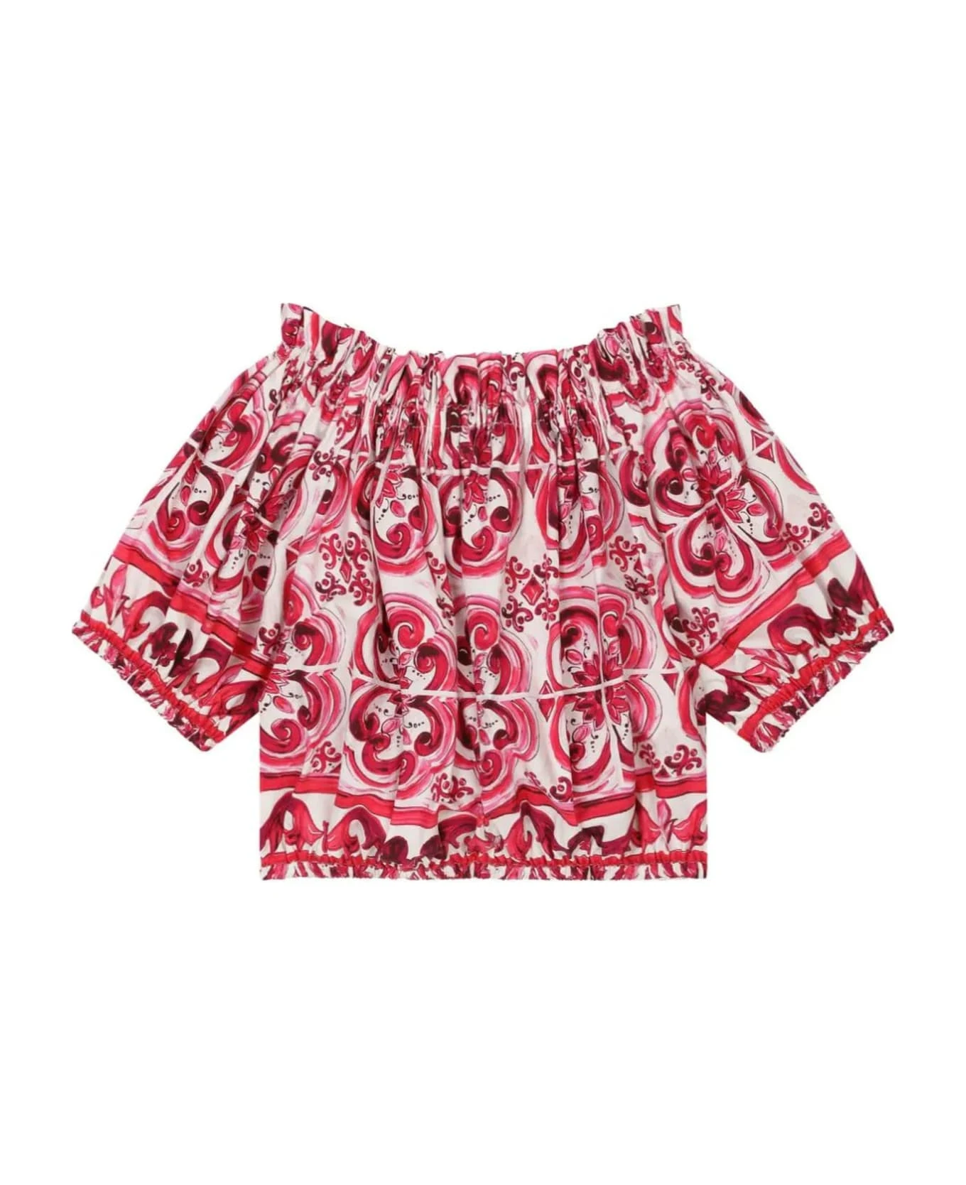 Crimson red and white cotton top, all-over Majolica print, elasticated neckline, off-shoulder, short puff sleeves, elasticated straight hem