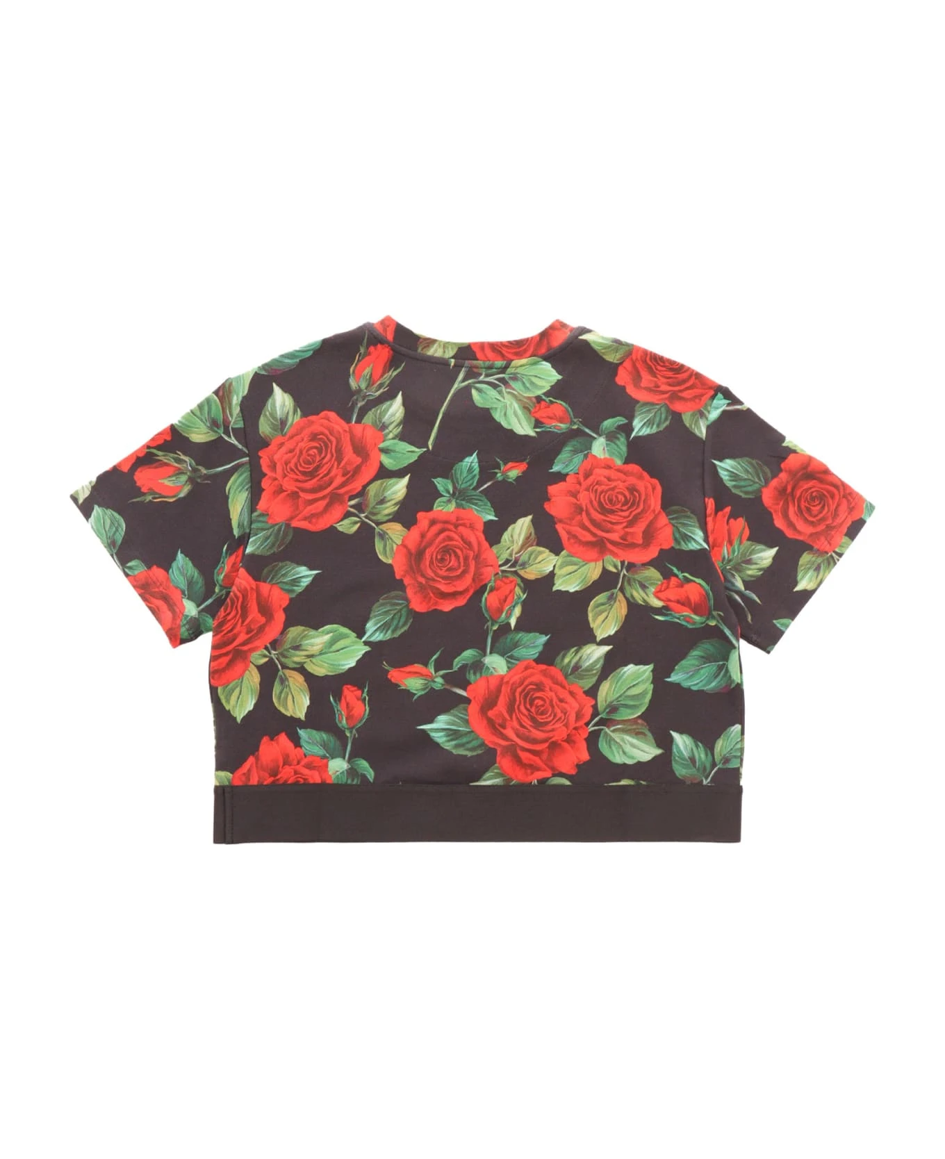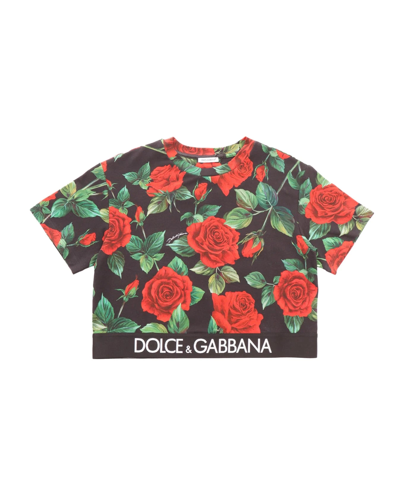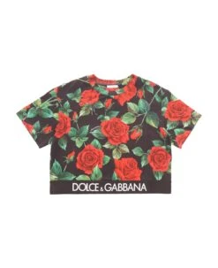 Stretch cotton T-shirt, rose print, signature detail, edge with logo inlay
