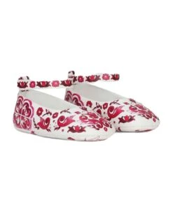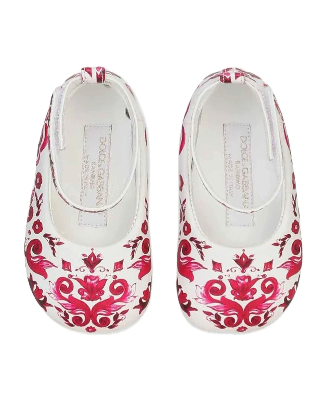 White/fuchsia ballet flats girl Dolce&Gabbana Kids. Majolica print, round toe, front closure with velcro strap and flat leather sole. Leather 100%