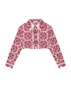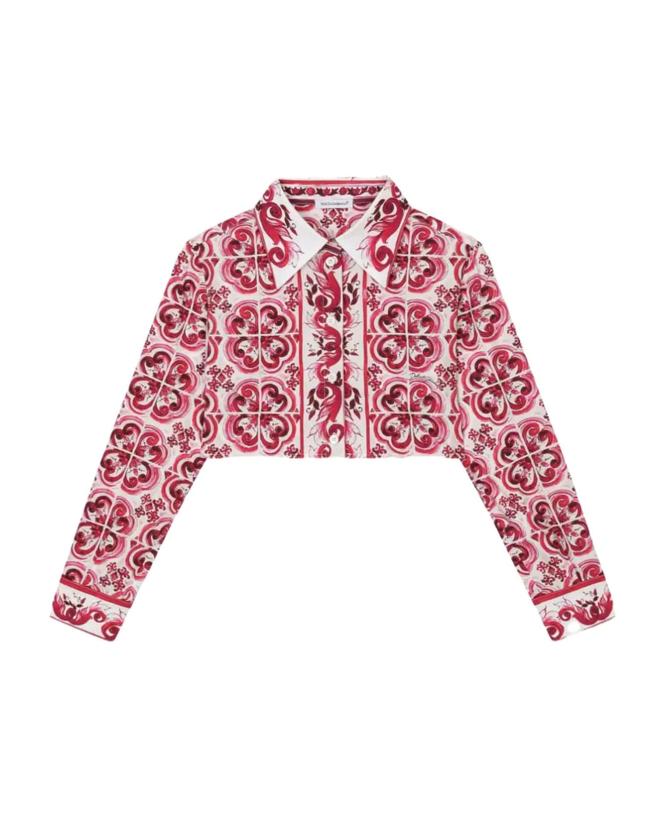 White/fuchsia shirt girl Dolce&Gabbana Kids. Majolica print, pointed collar, long sleeves, front closure with buttons and crop design. 100% Cotton
