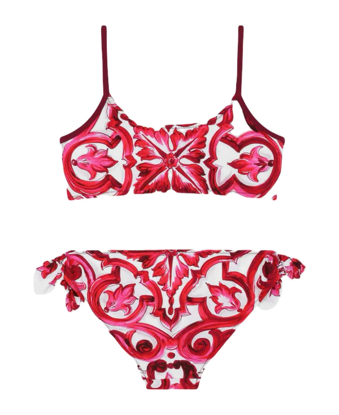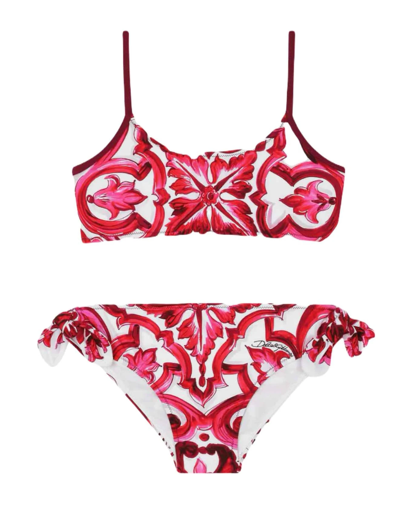 white/red bikini girl. Majolica print, stretch design, spaghetti straps and bikini bottoms with side knots. Nylon 88%, Spandex/Elastane 28%