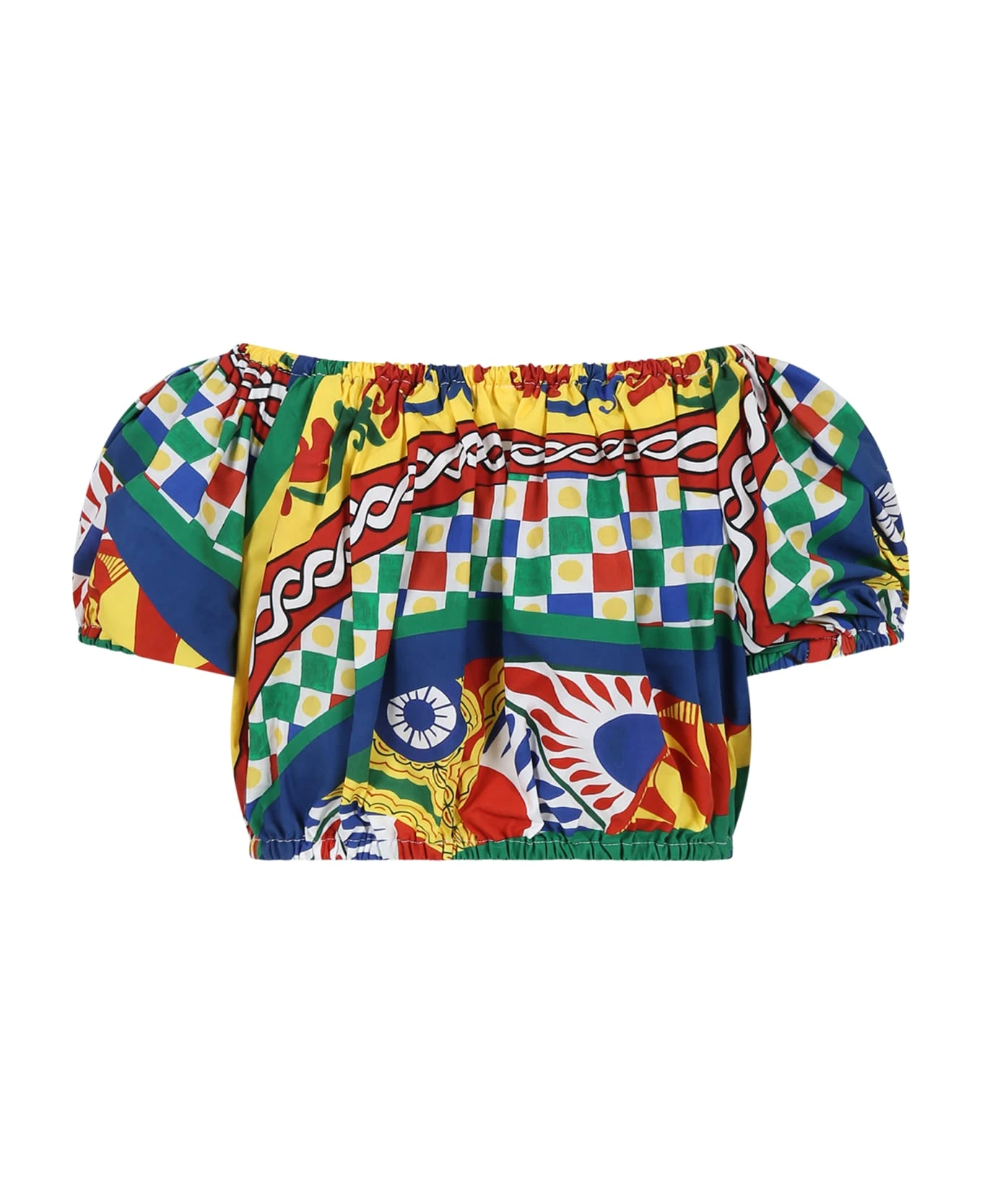 Yellow cropped top in cotton, with short sleeves, gathered collar, elastic on the bottom. It is embellished with all-over iconic cart print and with logo, on the front.