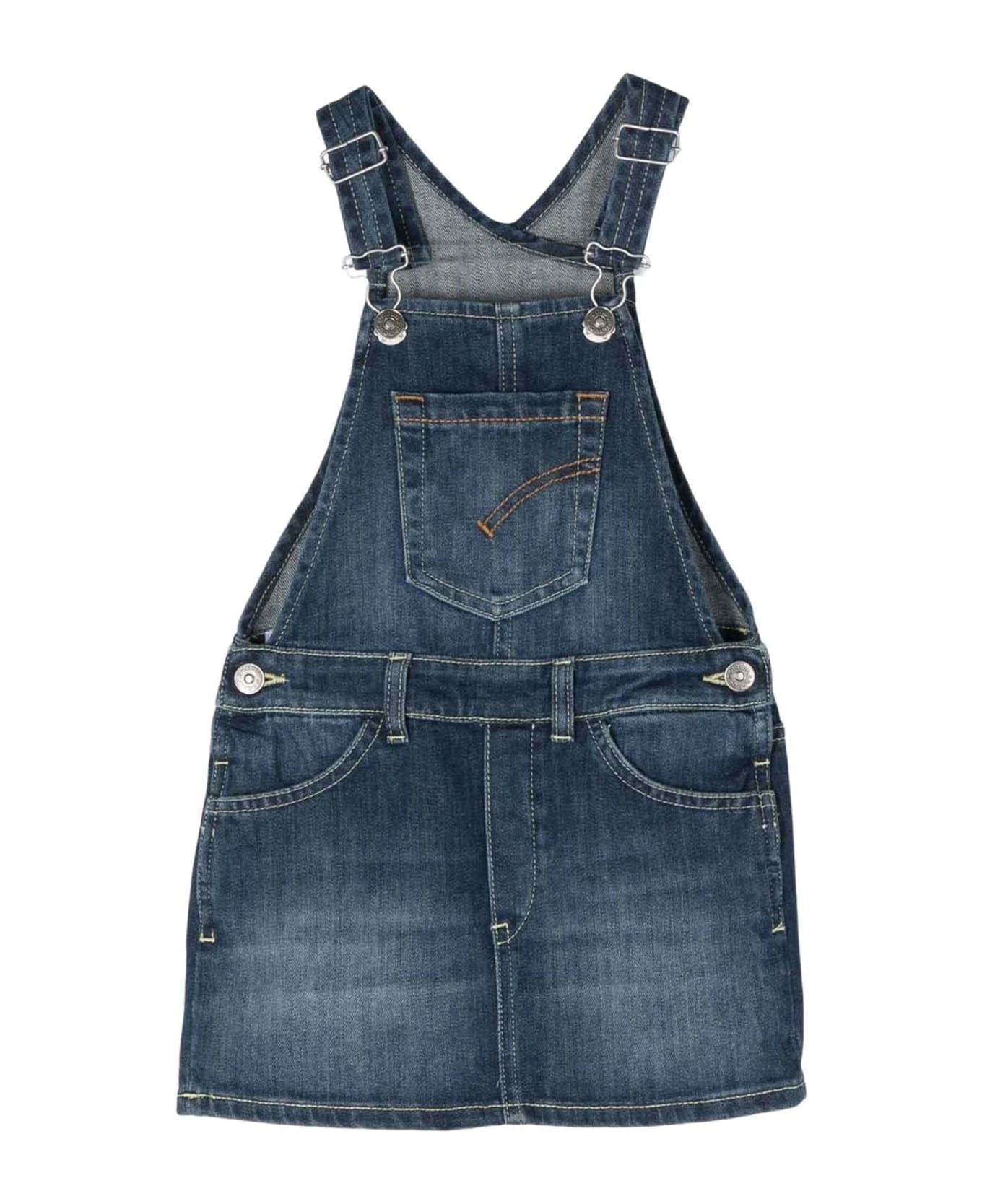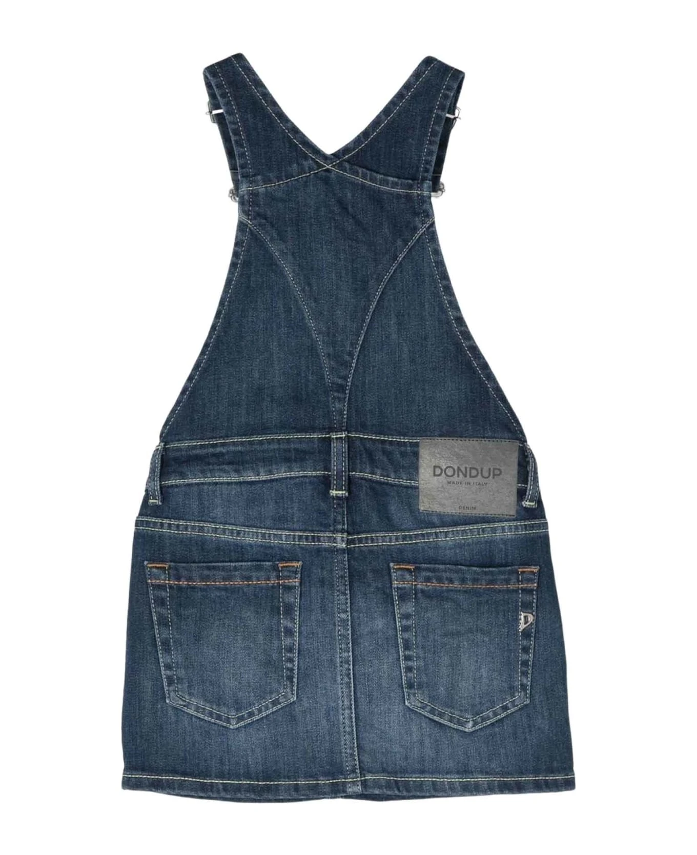 blue denim dress girl Gcds Kids. Back patch with logo, adjustable shoulder straps, front patch pocket, two side welt pockets and two shaped back pockets. Cotton 89%, Elastane 11%