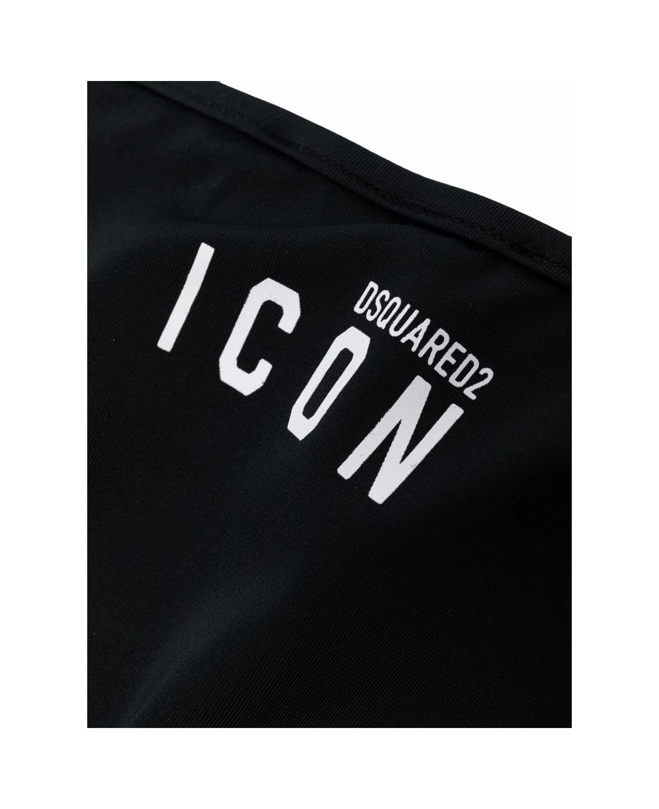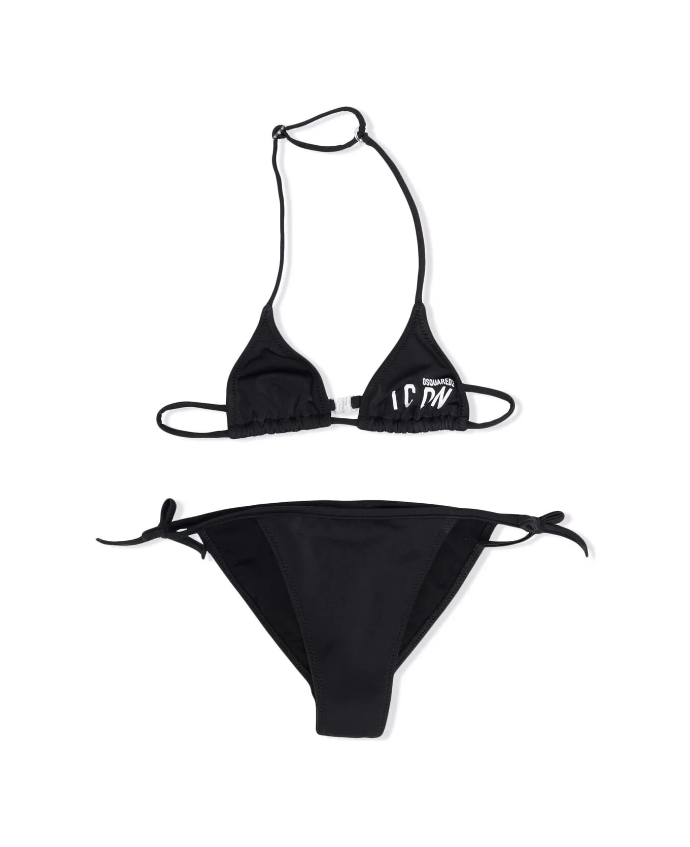 Black Icon bikini for girls by Dsquared2 Kids consisting of a slip with side laces and a triangle top with back closure, white Icon Dsquared2 logo print and adjustable fit behind the neck.