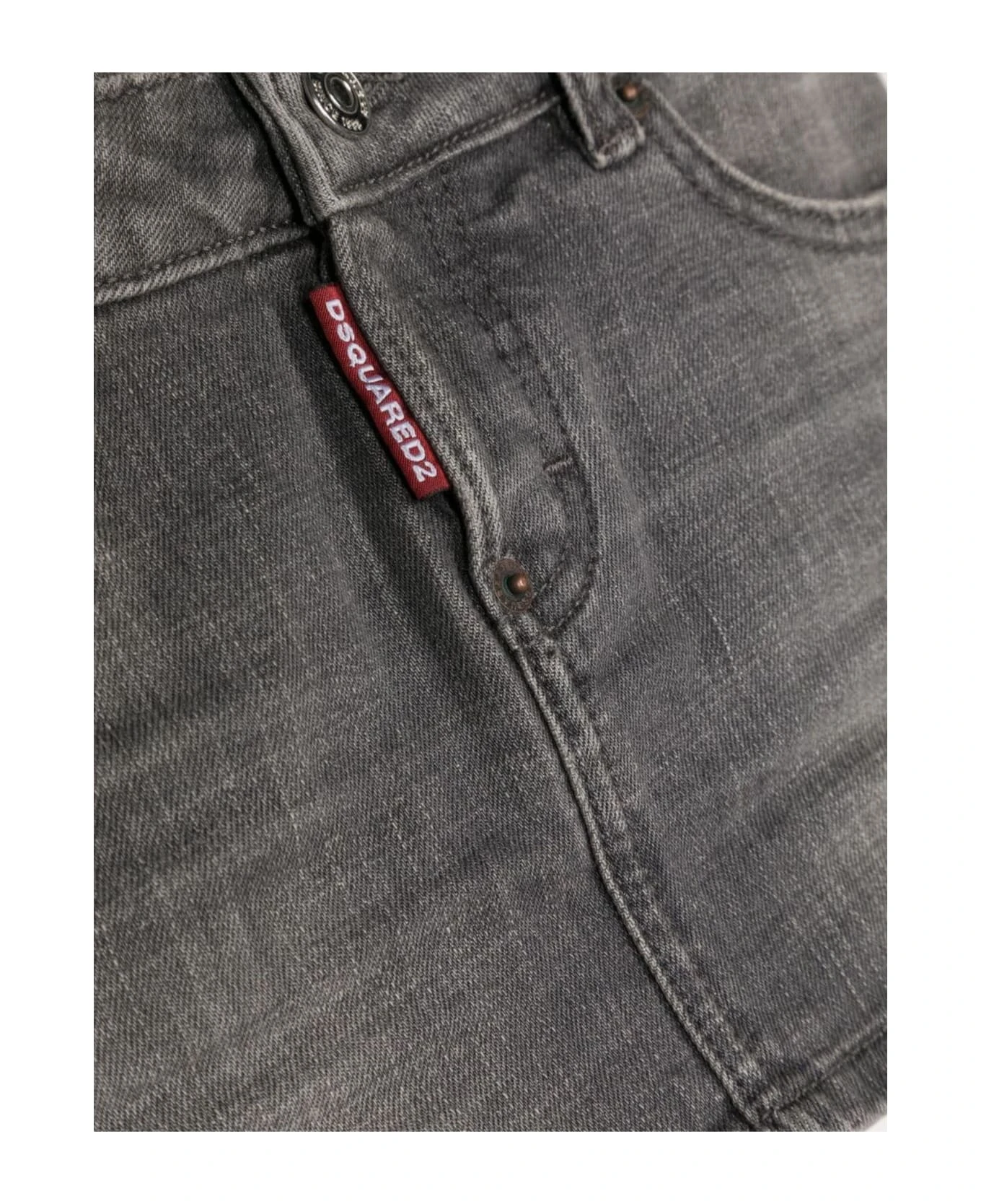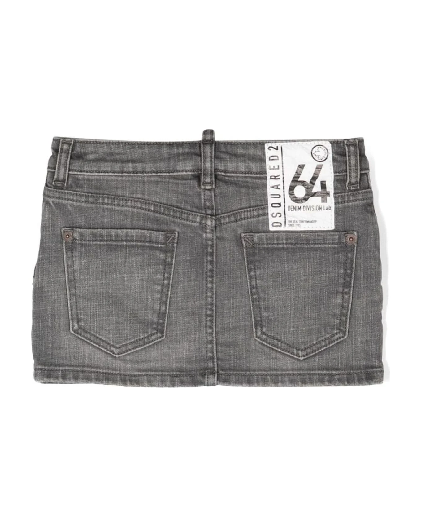 Light grey stretch-cotton denim skirt, light wash, belt loops, logo patch to the rear, thigh-length, front button and zip fastening, classic five pockets