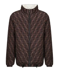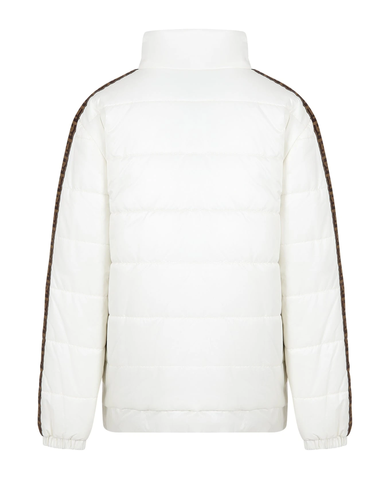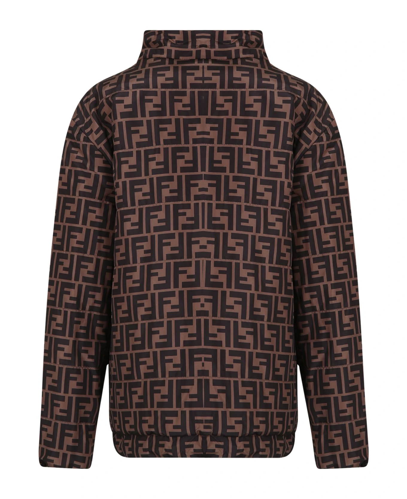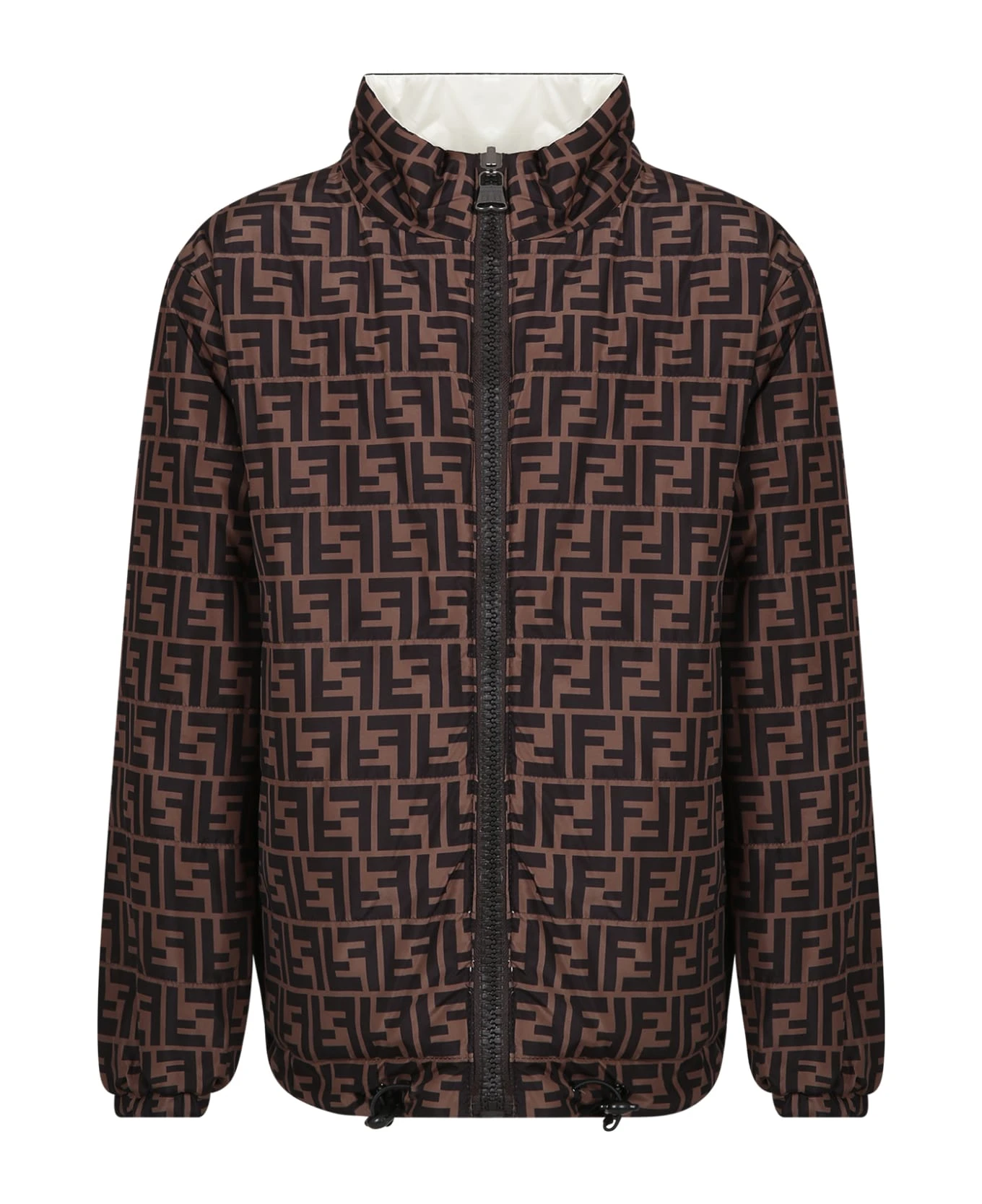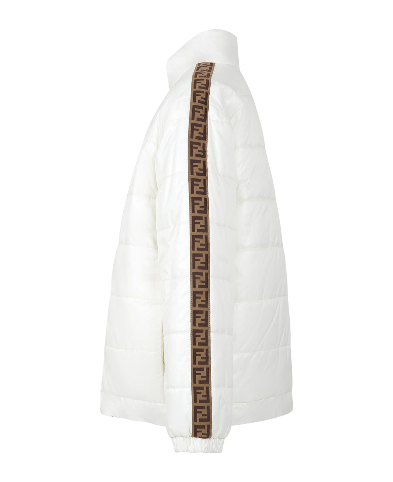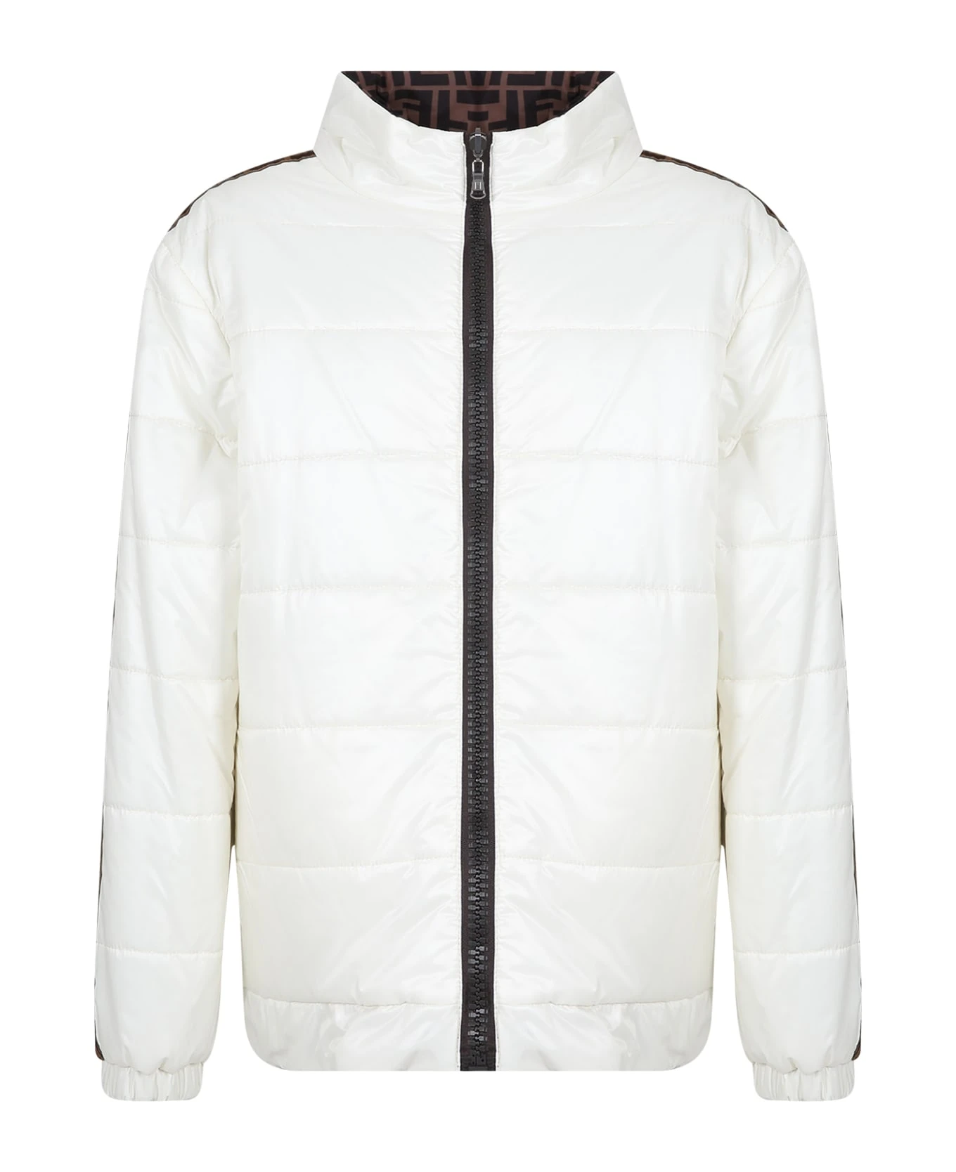 Reversible padded jacket, with side pockets, with fleece lining inside, closure with zip and elastic coulisse on the bottom; one side is avory, with tobacco FF stripes appliqued on the sleeves and the other side has got all-over tobacco FF logo print.