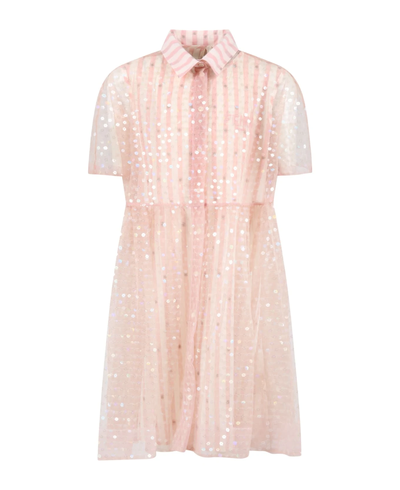 Pink dress composed of sleeveless striped cotton petticoat, with crew-neck and button closure on the back, embellished with all-over embroidered beige flowers and pink logo embroidered on the chest; the top is made of tulle with button closure and cut out at the waist, it is embellished with all-over flower-shaped sequins.