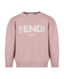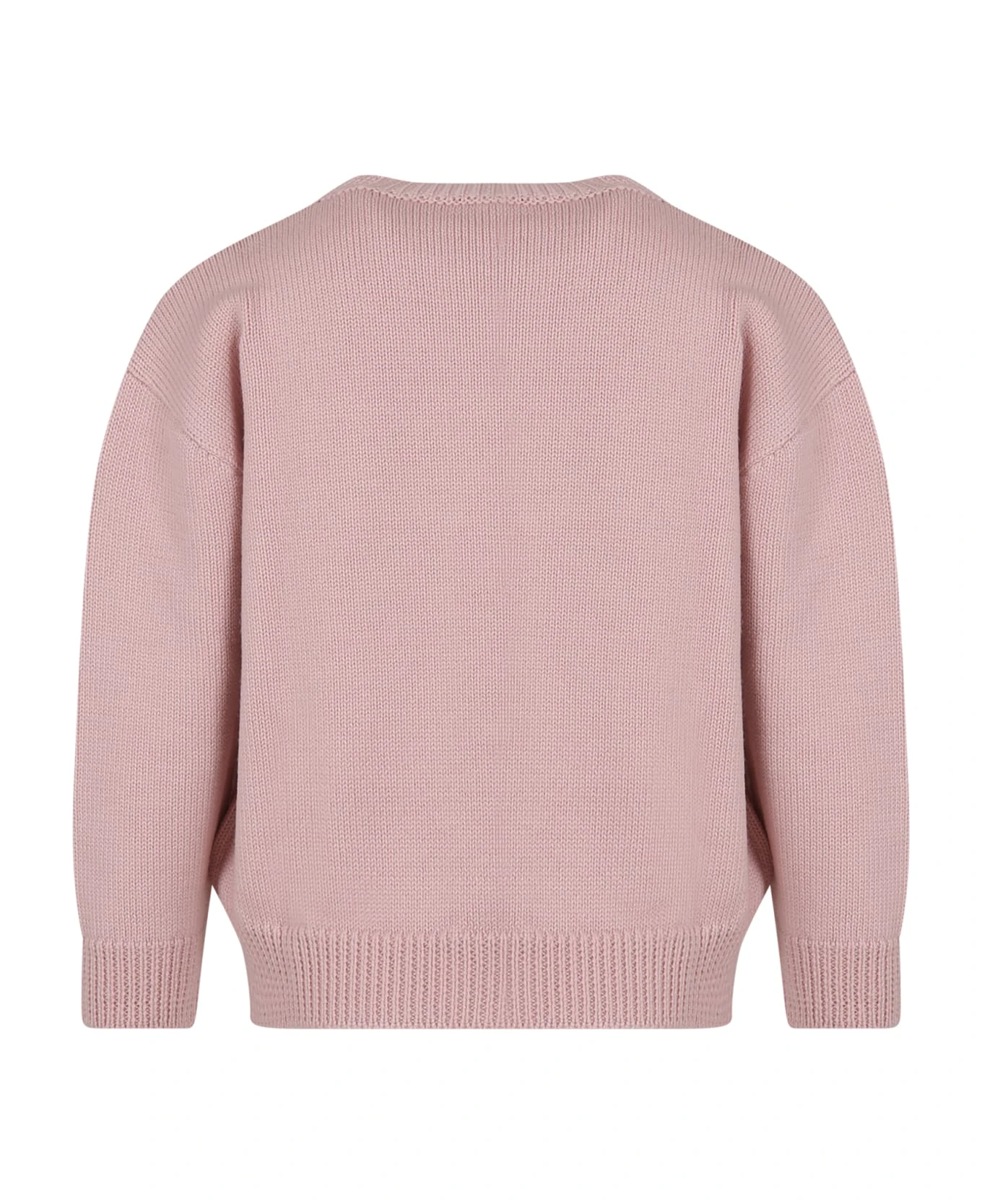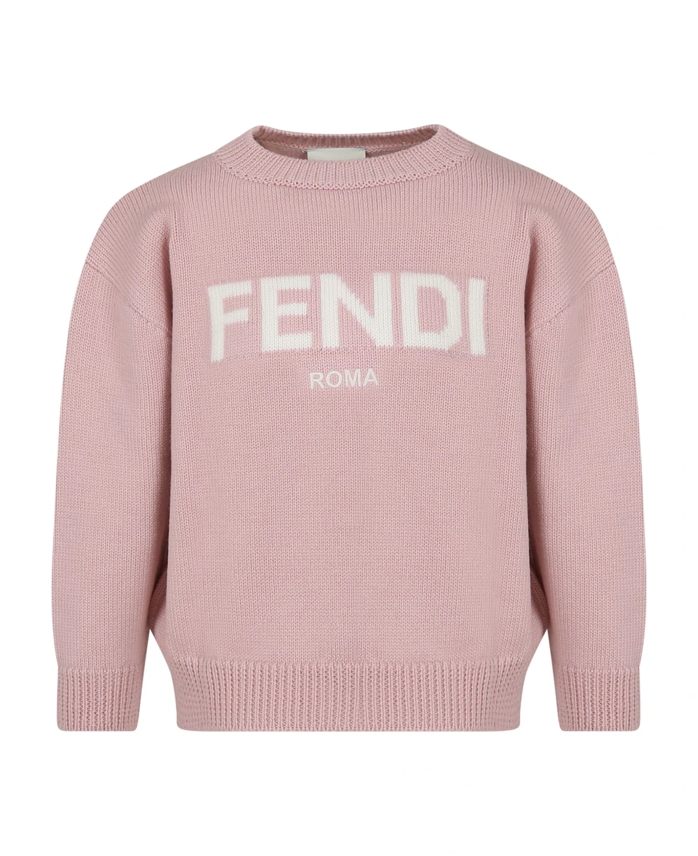 Pink sweater made from soft wool, with round neckline and long sleeves; it is embellished with intarsia logo in a contrasting white on the front.
