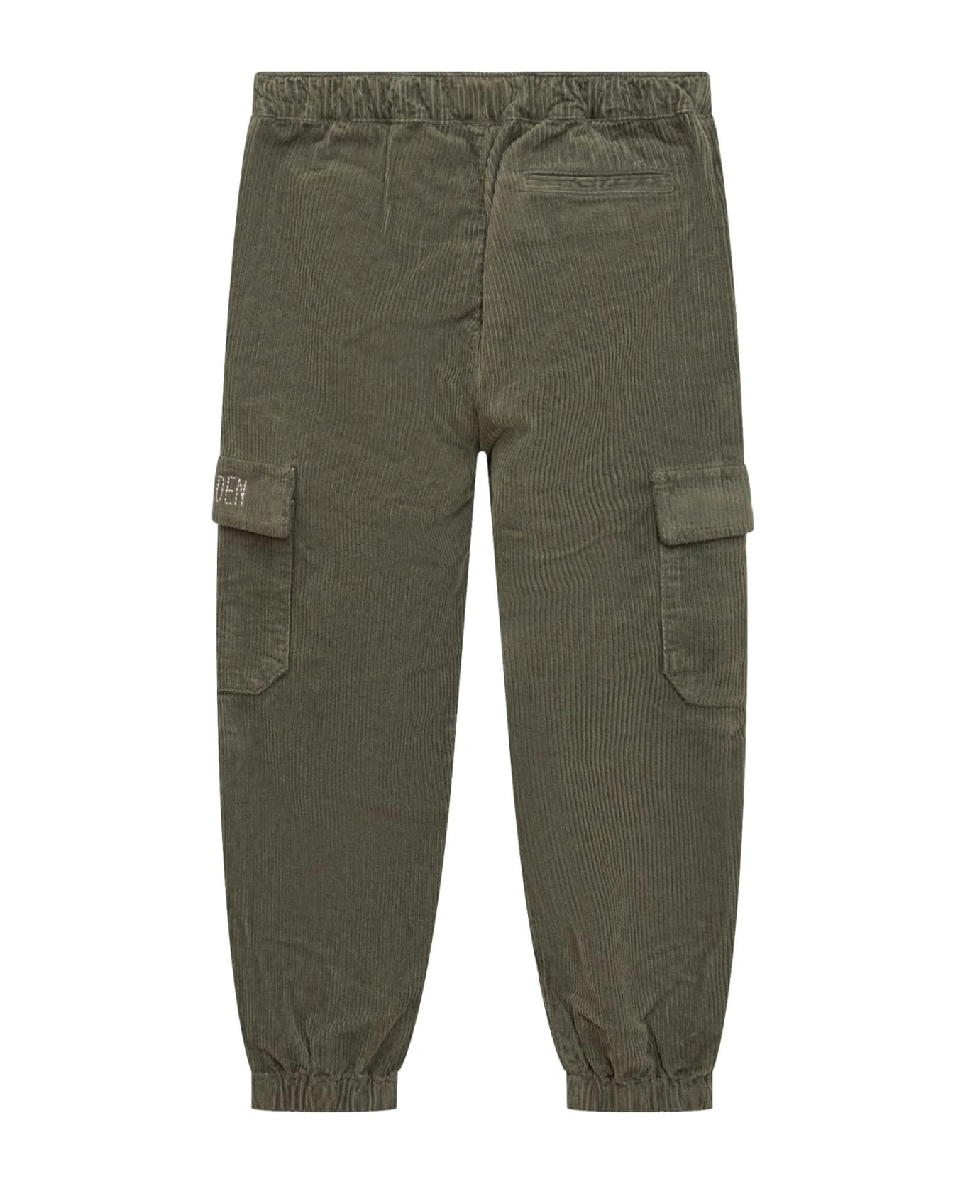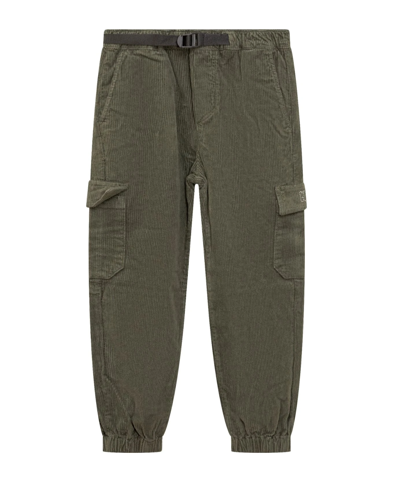 Green long trousers. Elastic band and waist belt. Side and back pockets. Logo with rhinestones on the side. Elastic at the ankles.