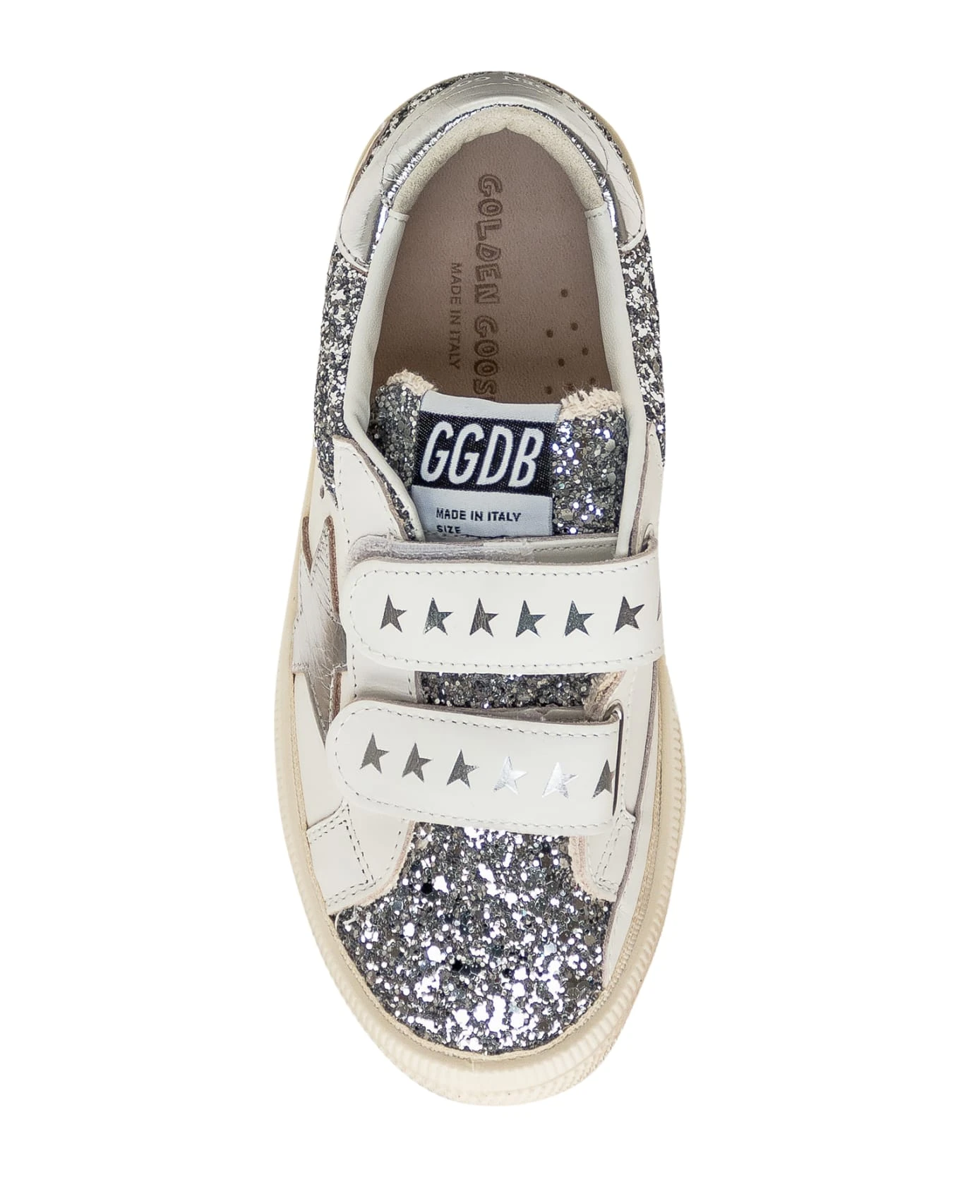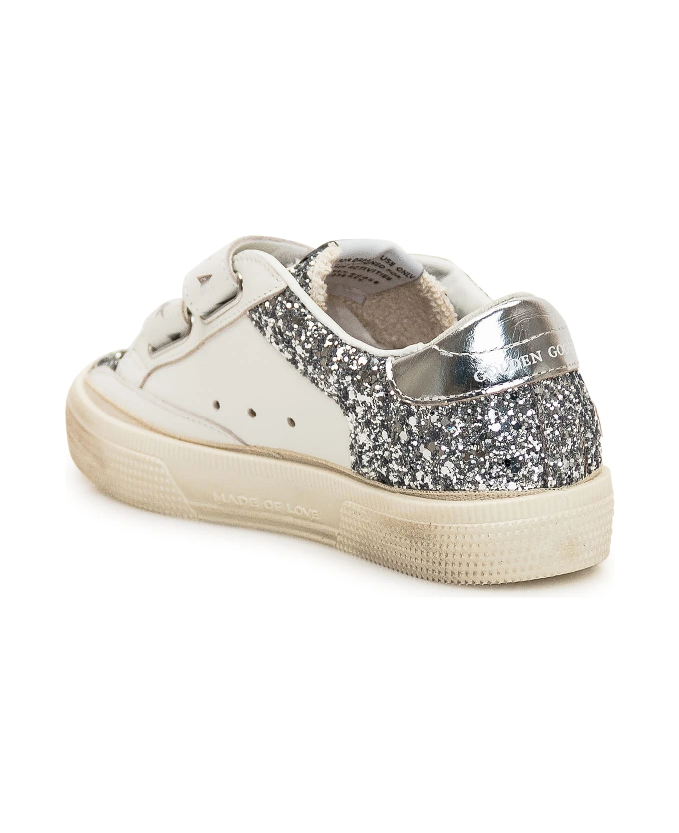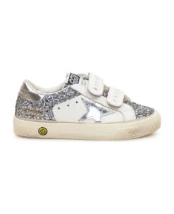 White low-top sneaker. Tear closure. Star patch on the side. Contrast heel with logo. Glitter details on the front and heel.