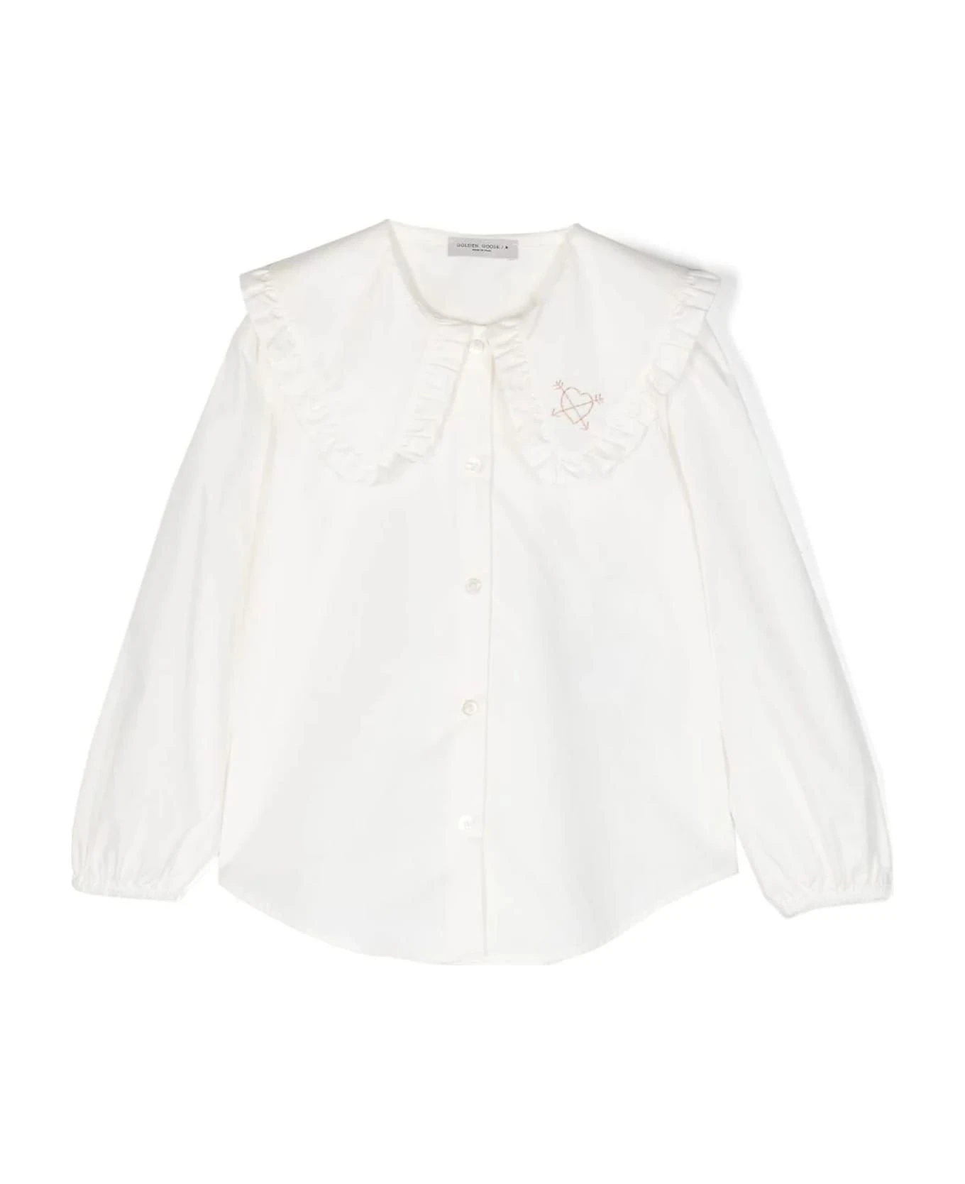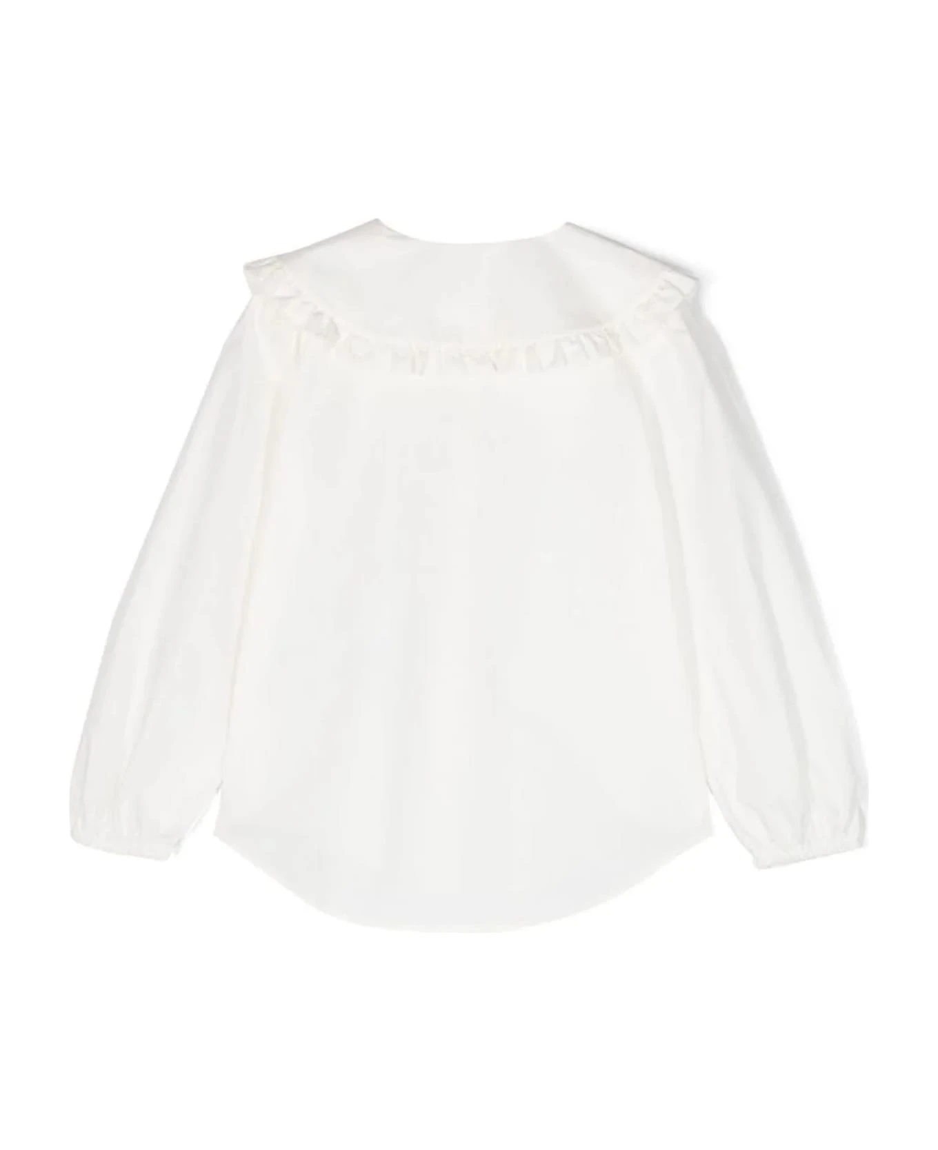 Off-white cotton blend shirt, rounded collar, frilled collar, embroidered motif, front button fastening, long sleeves, elasticated cuffs, curved hem