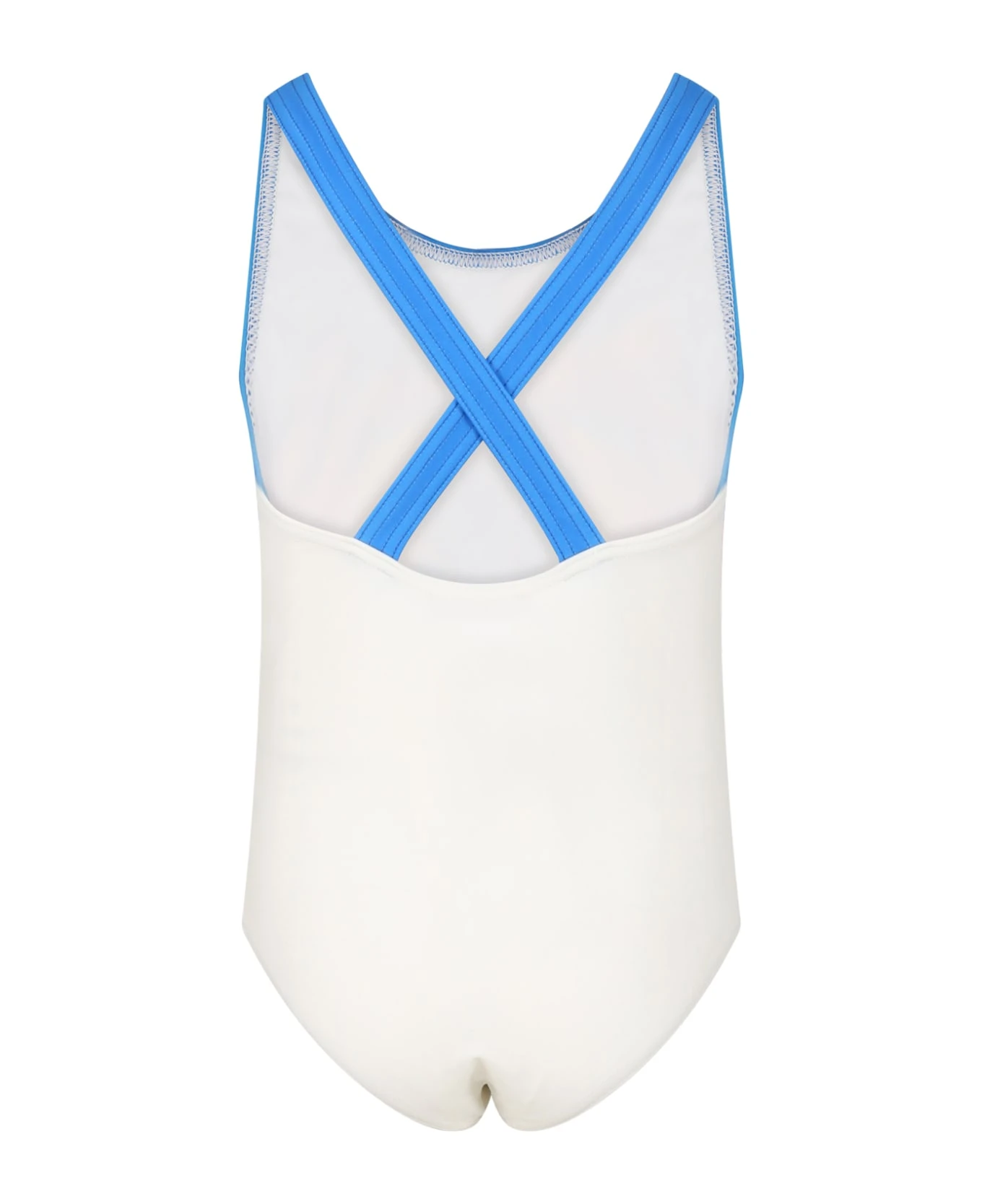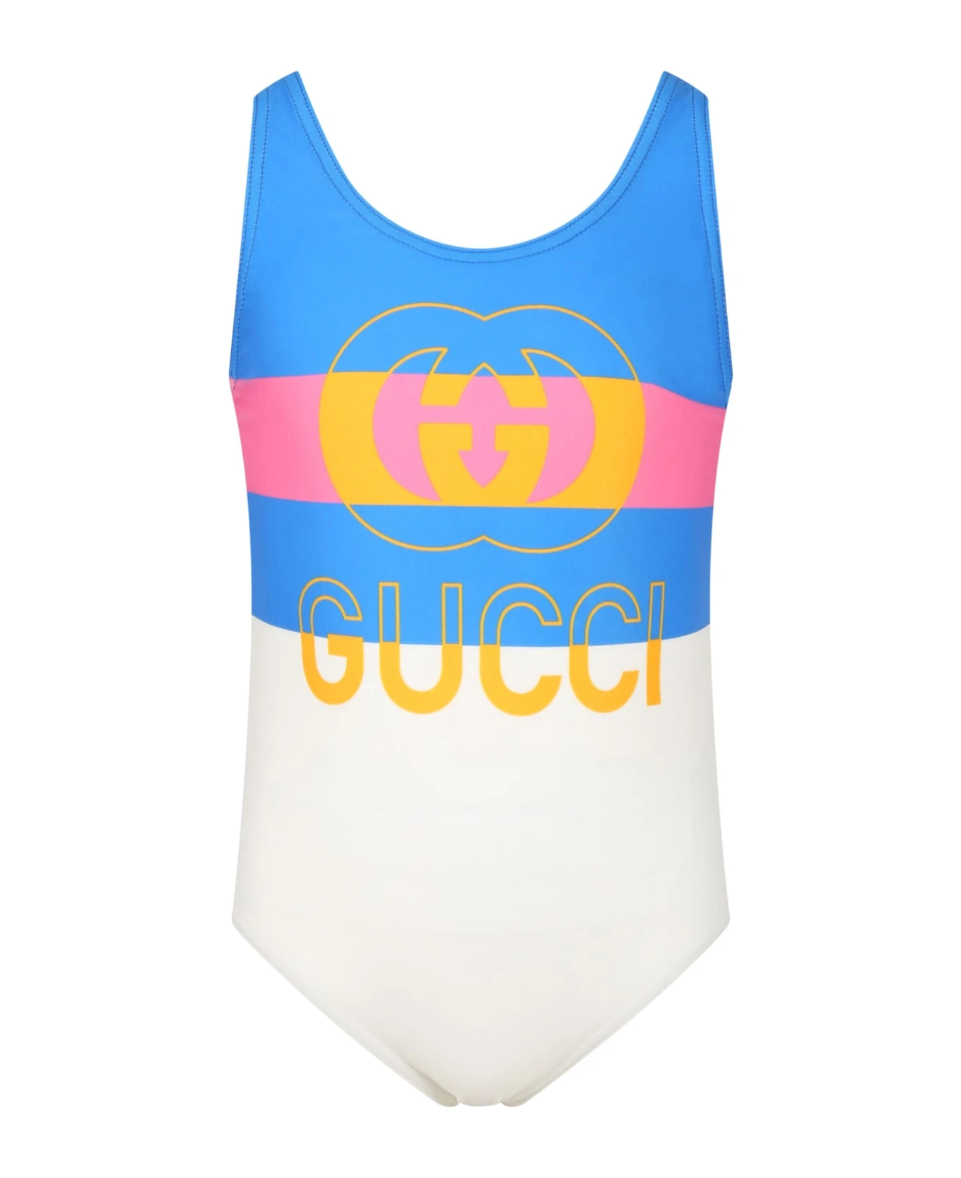 : Costume avorio intero, con spalline incrociate sulla parte posteriore. È decorato con stampa vintage e iconica doppia GG, sulla parte anteriore.