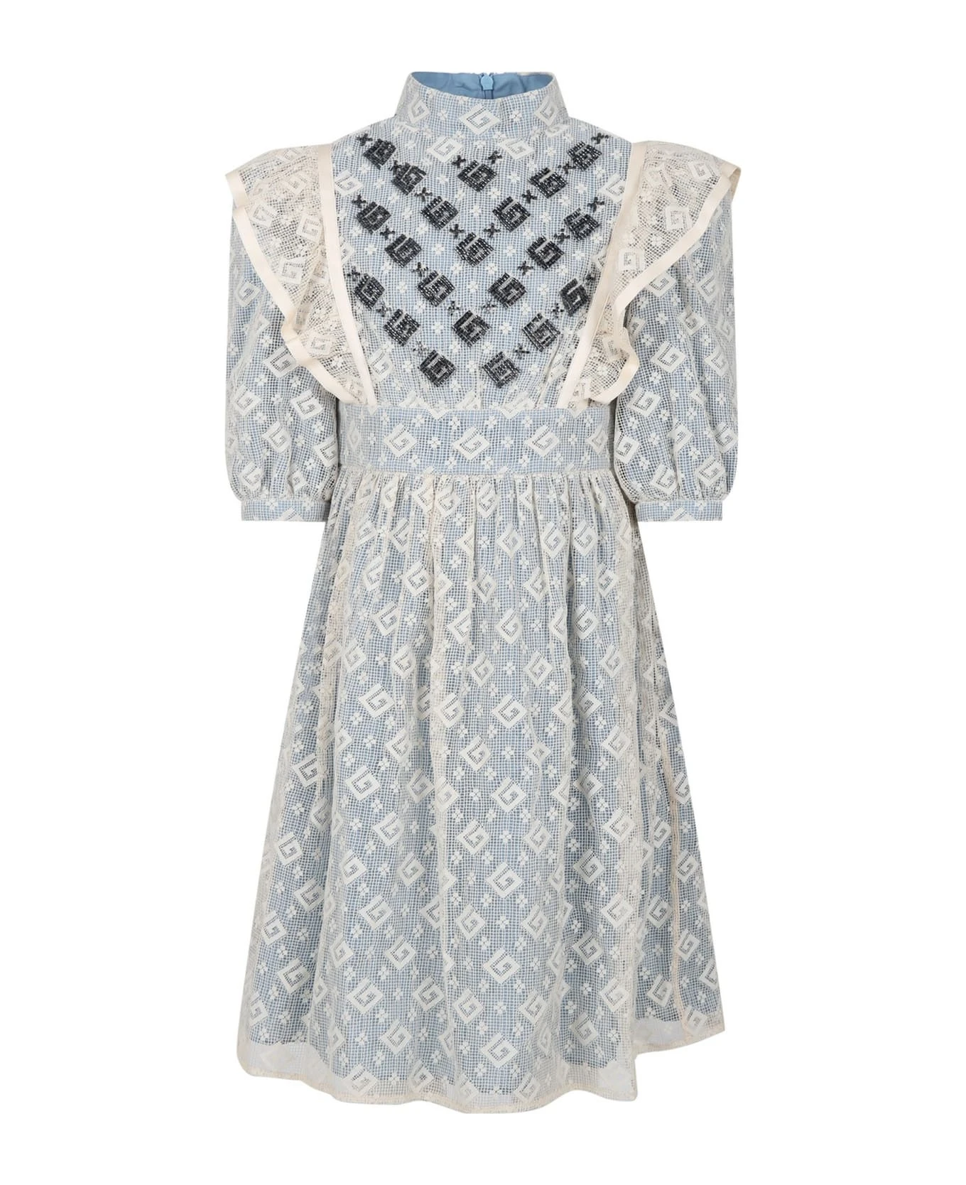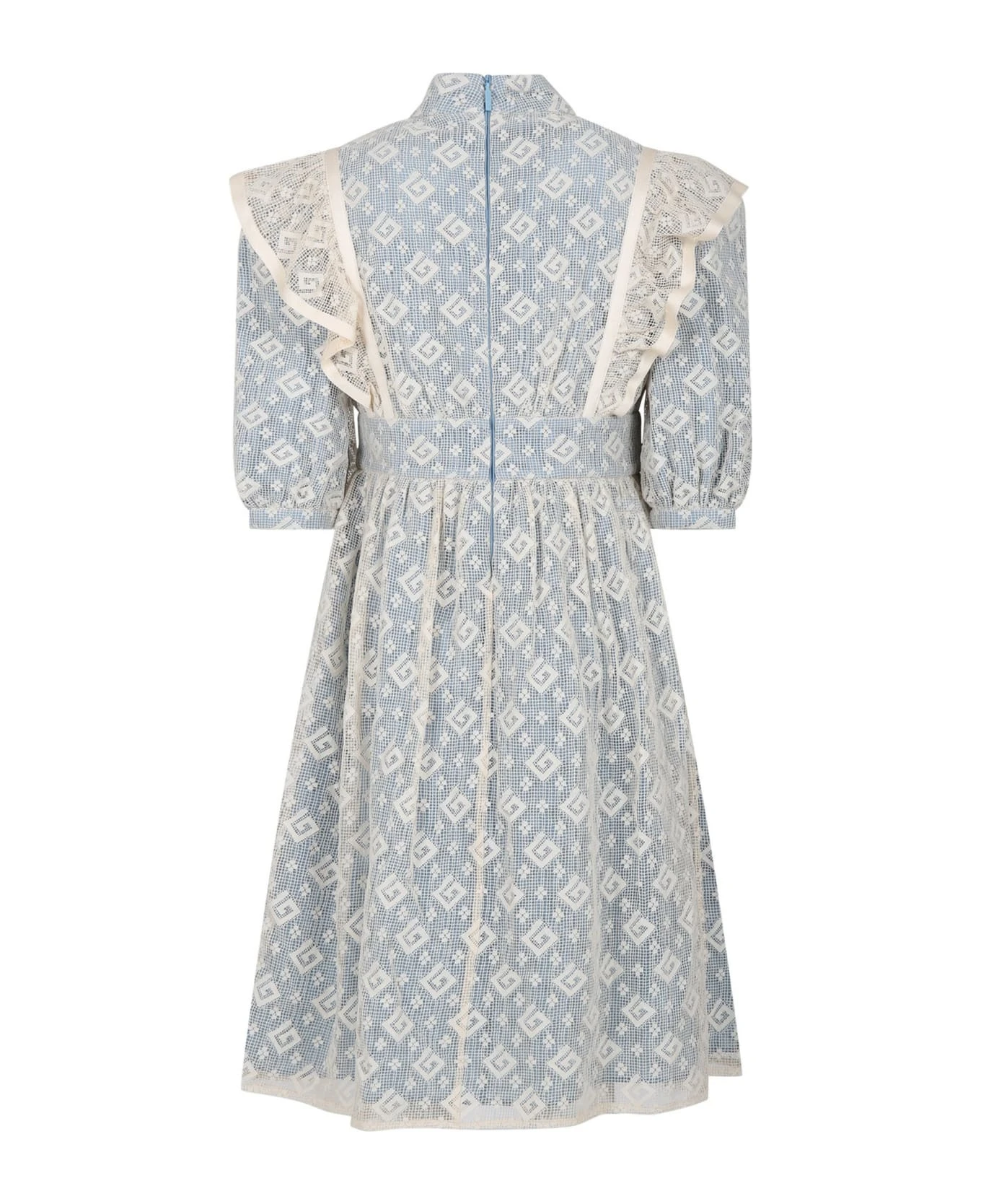 Light blue dress in cotton, with balloon sleeves, high neck, zip closure on the back and rouches on the shoulders. It is embellished with all-over iconic G motif and beaded G embroidery on the front.