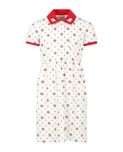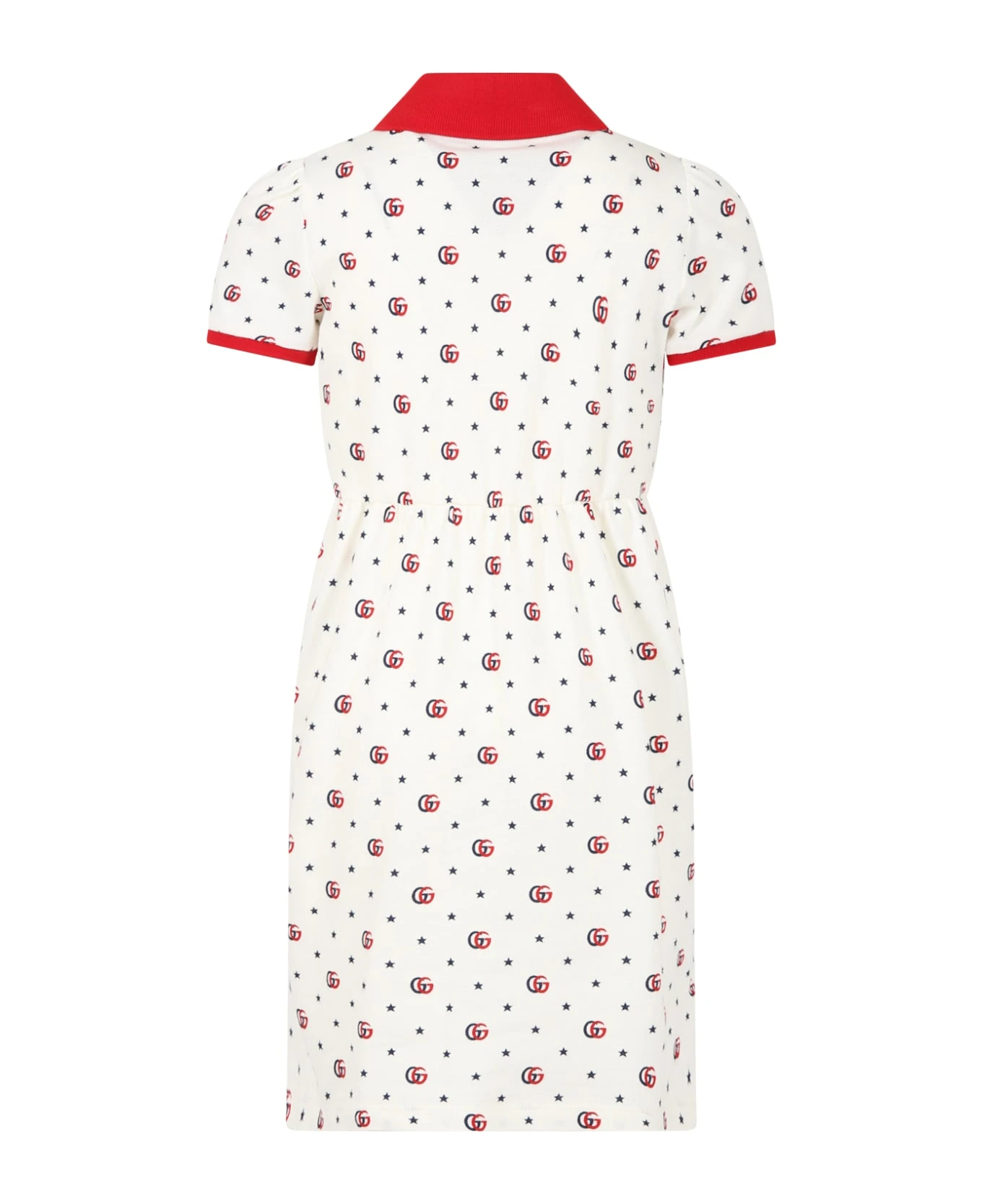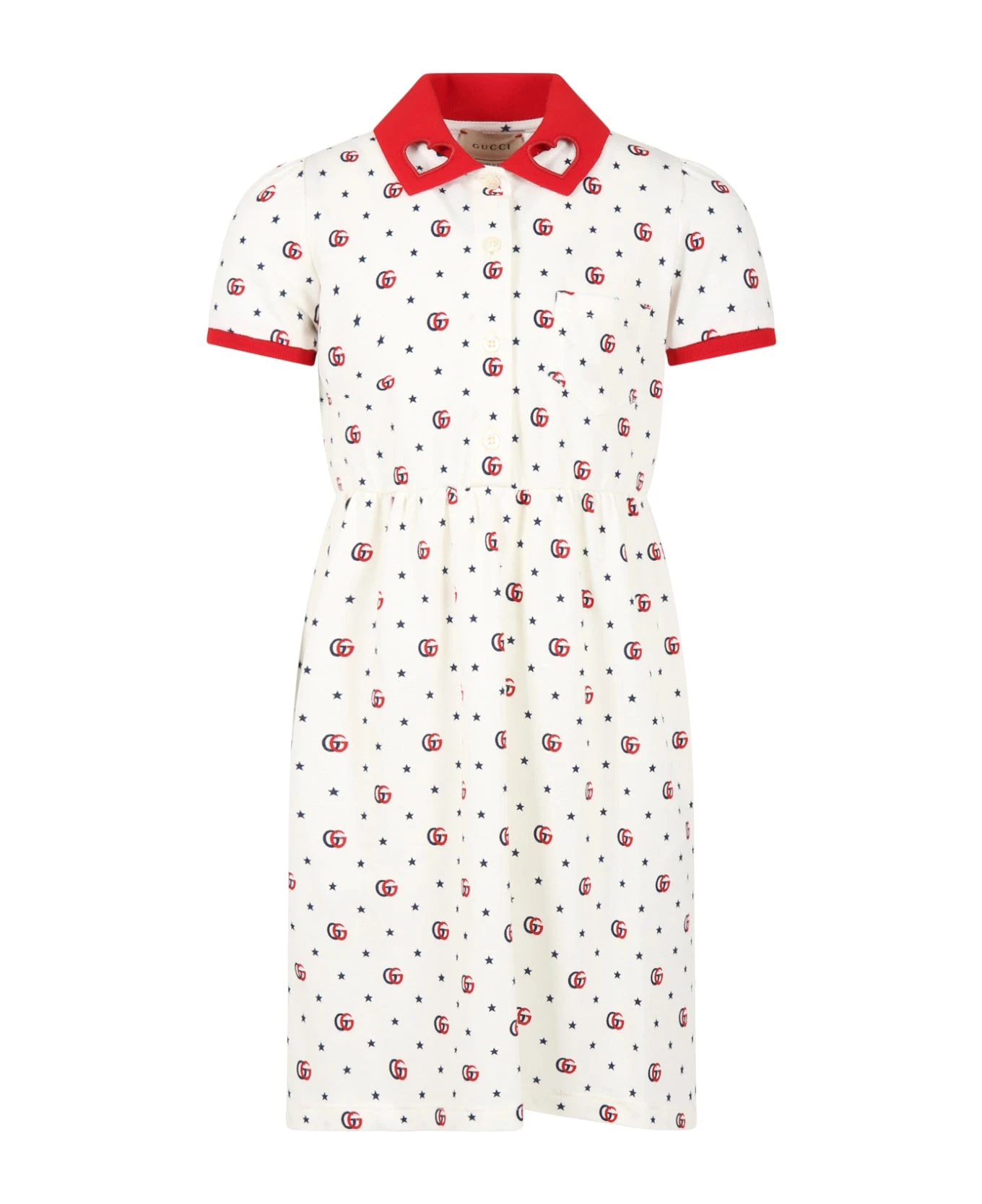 White dress in cotton, with short sleeves, classic collar, ribbed hem and button closure on the front. It is embellished with Double G print and all-over stars and hearts embroidered on the collar.