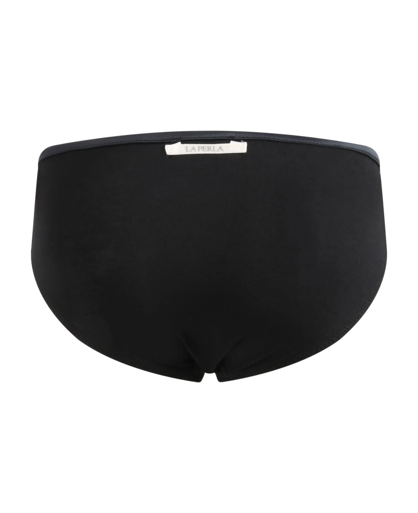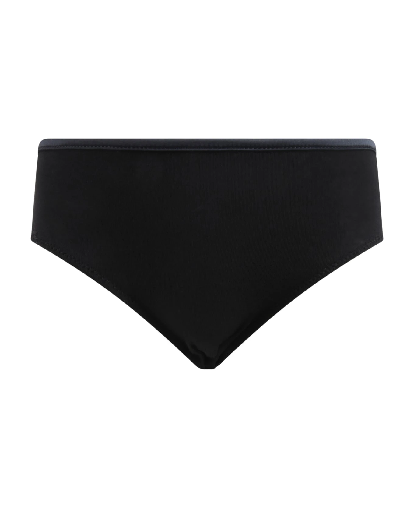 Black knickers with elasticized waistband, embellished with satin hem and logoed patch, on the back.