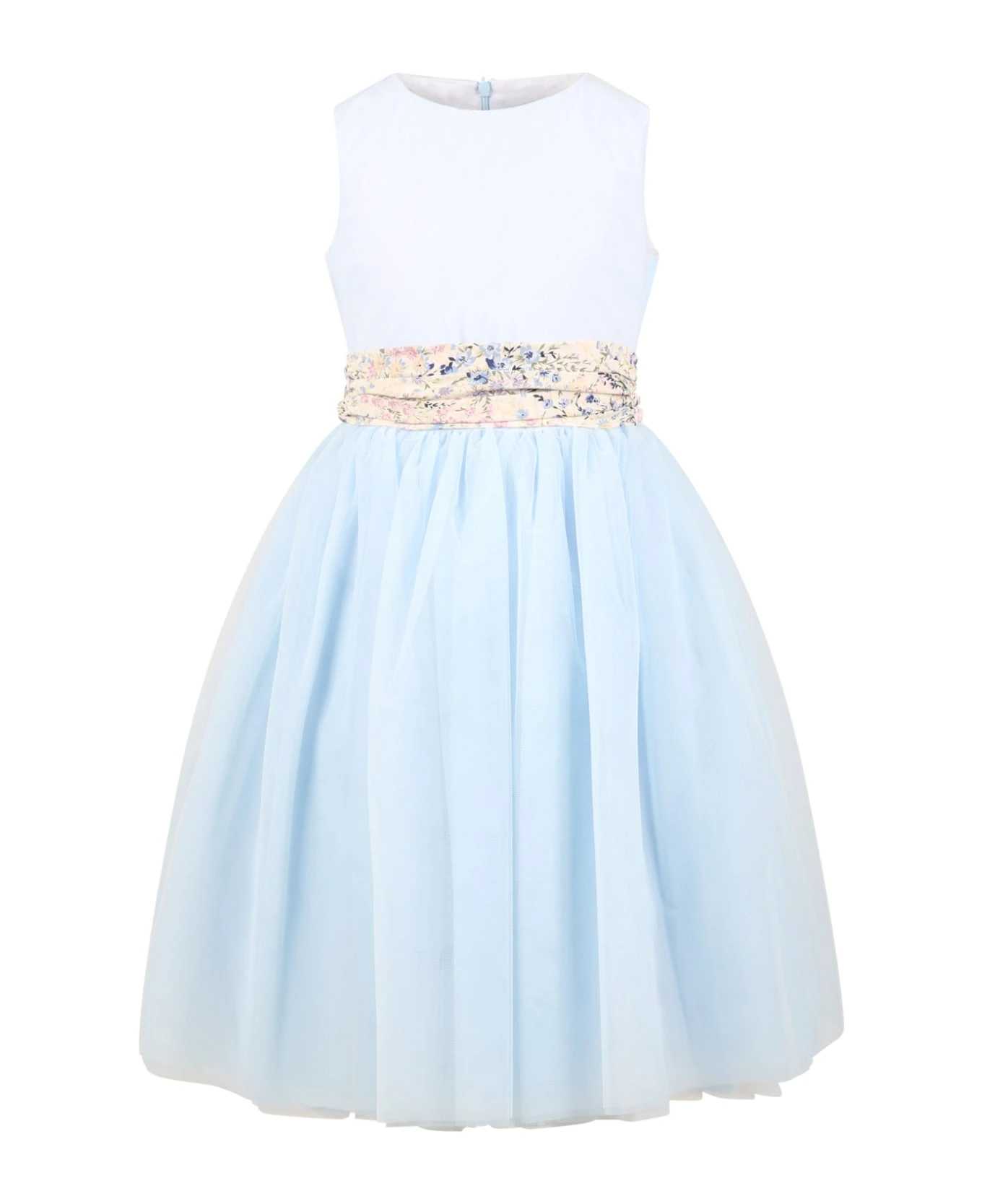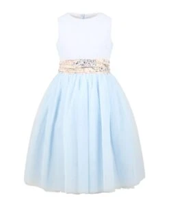 Light blue sleeveless dress, with zip closure on the back. It is embellished with tulle skirt and ivory belt with floral print.