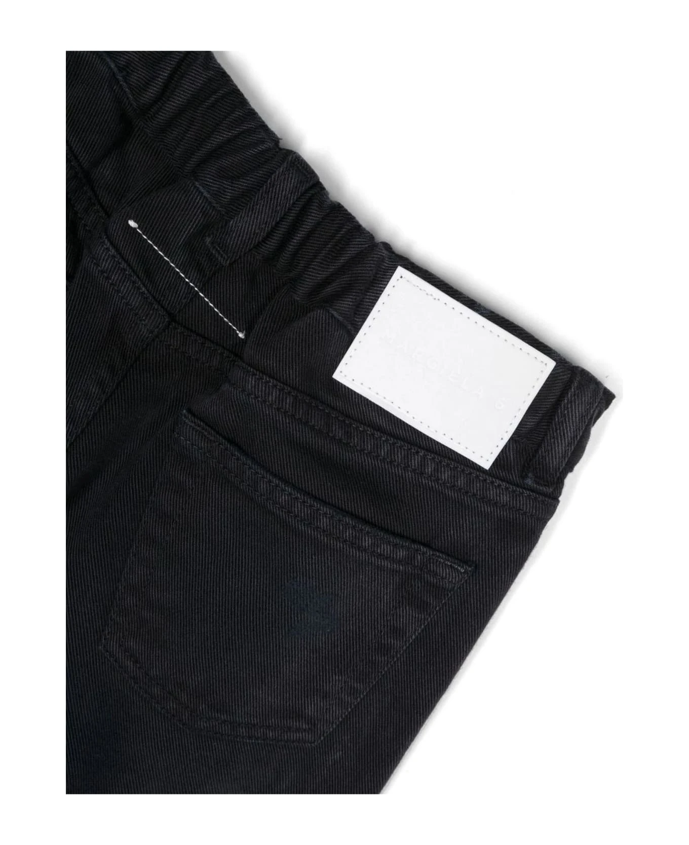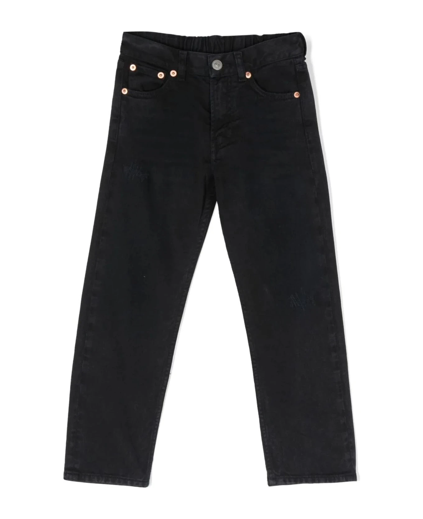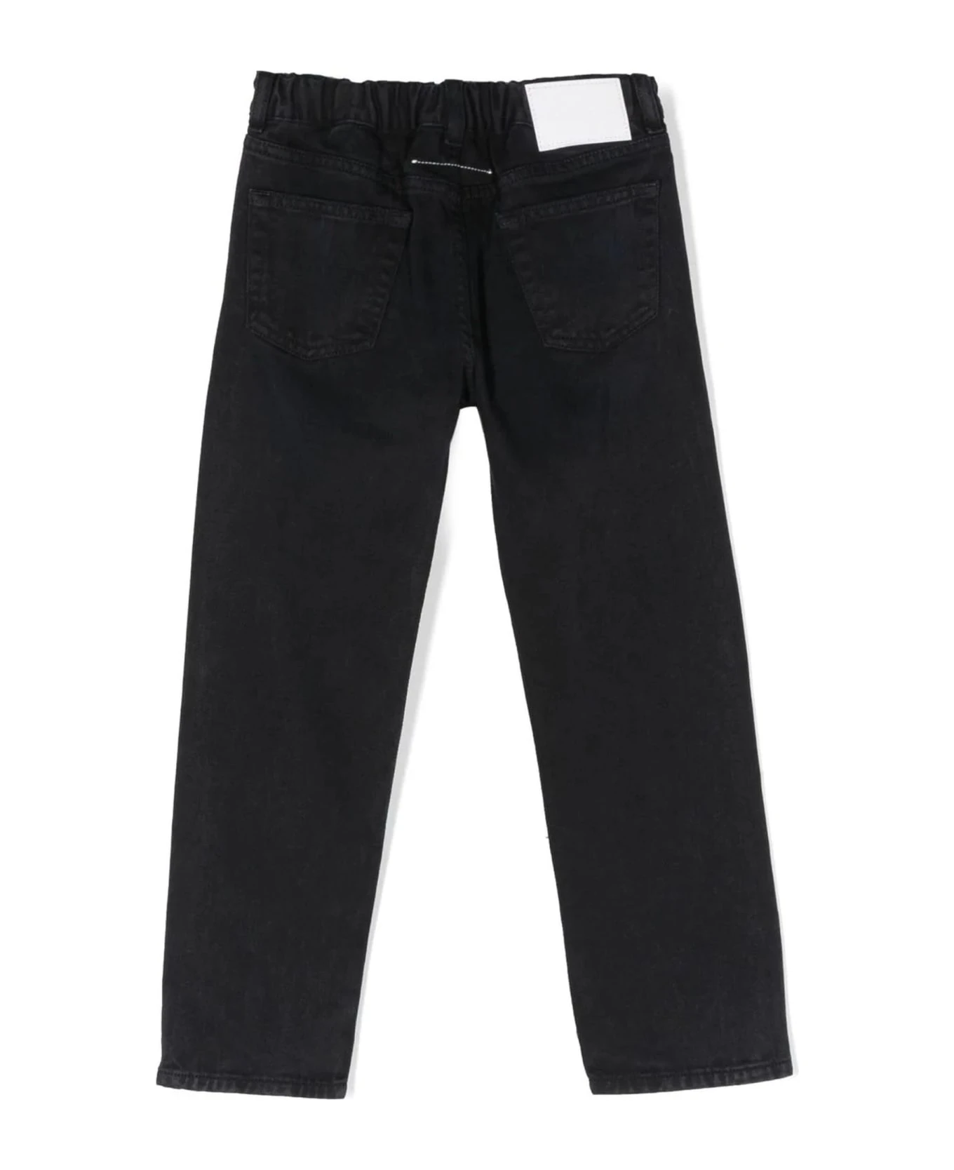 Black cotton jeans, belt loops, logo patch to the rear, concealed fly and button fastening, classic five pockets, rear patch pocket, straight leg