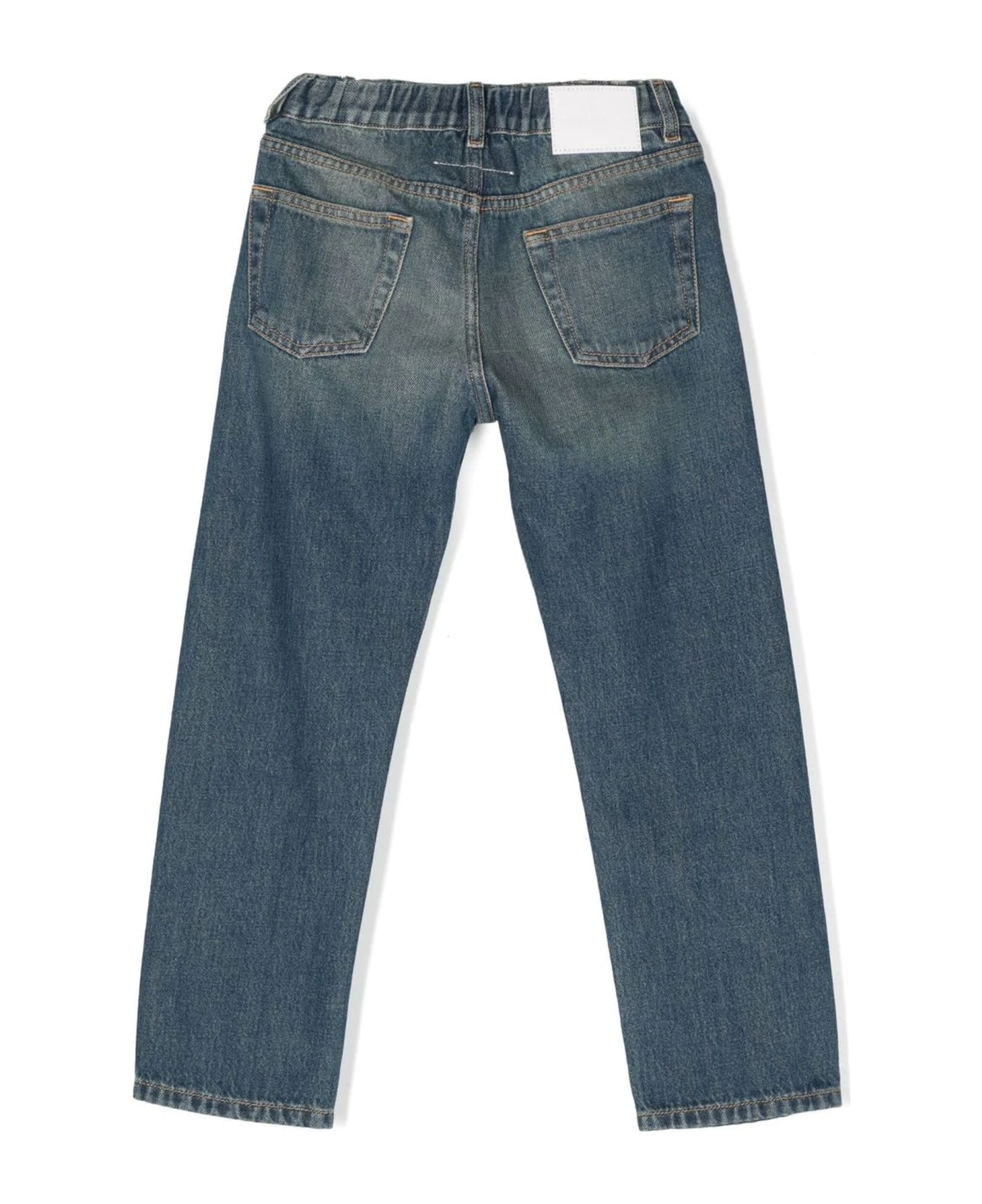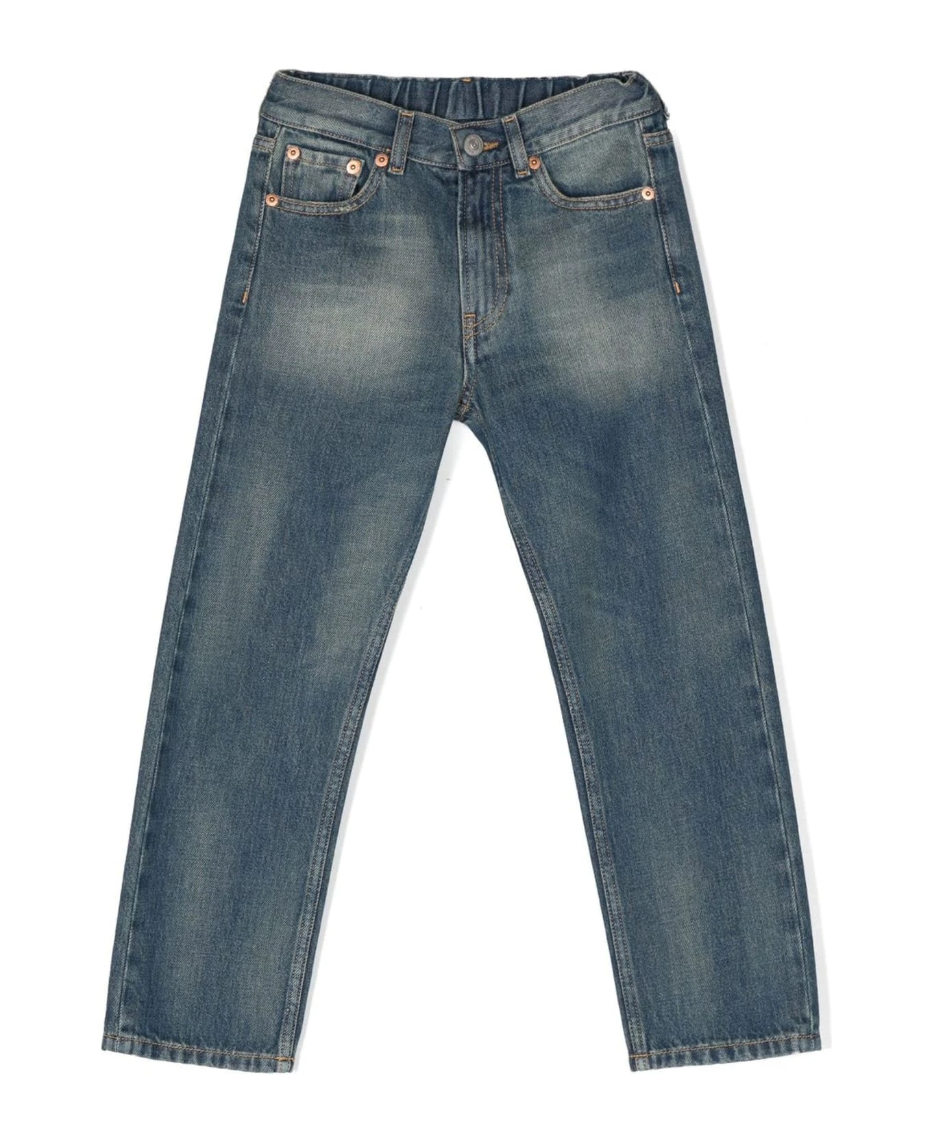 Indigo blue cotton jeans, washed denim, whiskering effect, logo patch to the rear, belt loops, concealed fly and button fastening, classic five pockets, rear elasticated waistband, straight leg