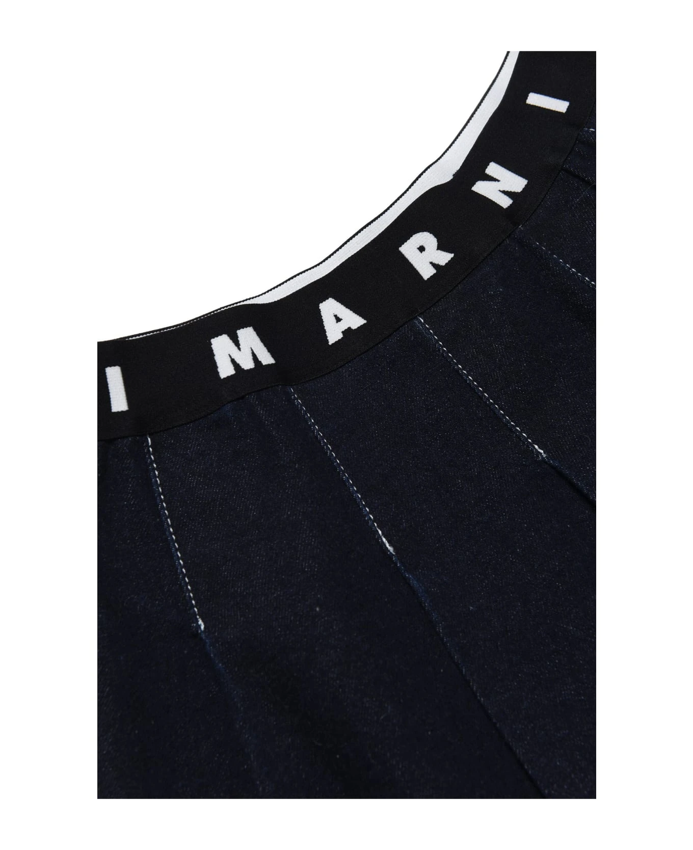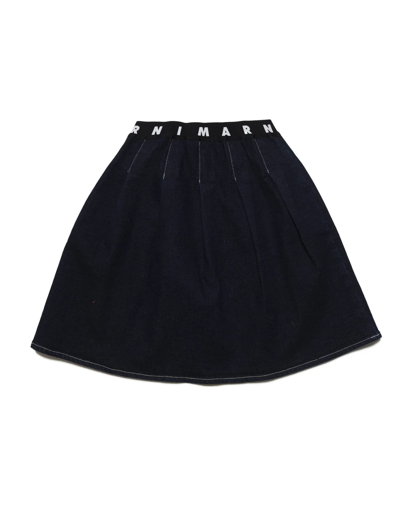 Dark blue jeans skirt with Marni logoed elasticated waist. The garment is slightly taken up to create a pleated effect. A garment in which jeans take center stage, extremely versatile and easy to match.