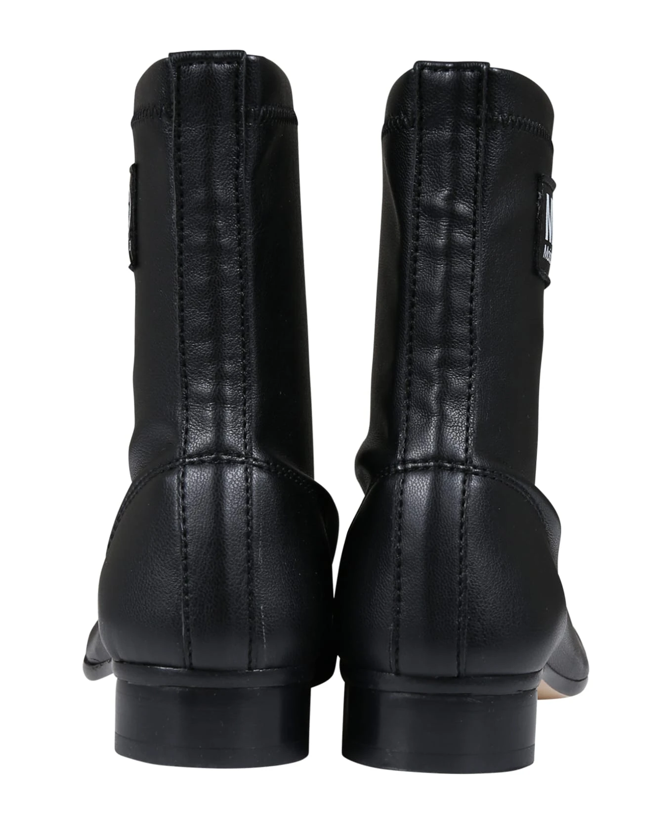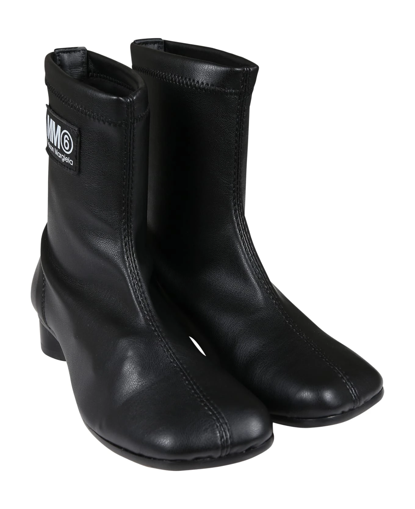 Black leather ankle boots, with leather sole, asymmetric toe, cylindrical heel. They are embellished with logo patch on the side.