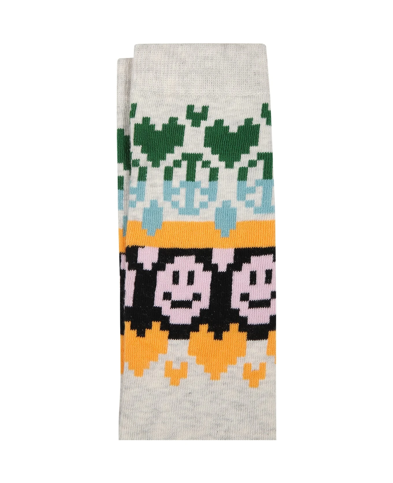 Grey set composed of two pairs of socks, with ribbed hem; one pair is in ribbed knit, the other is embellished with a smile and peace symbol.