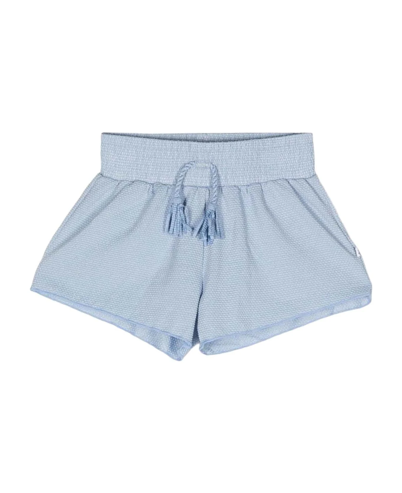 Light blue shorts girl kids. Stretch design, embossed finish, elasticated drawstring waist, mini logo plate, tassel detail and above knee length. Nylon 87%, Metallic Fiber 7%, Spandex/Elastane 6%