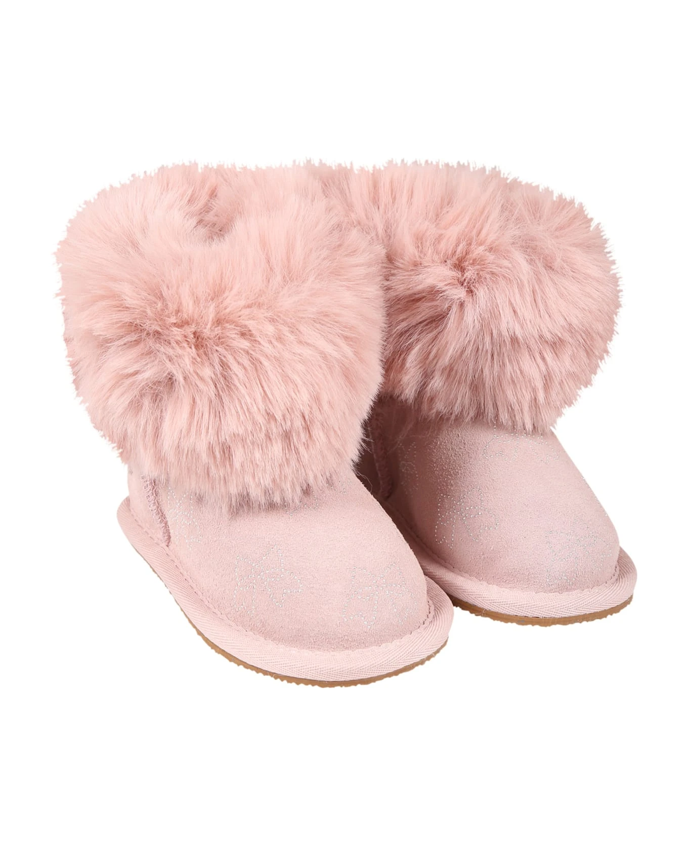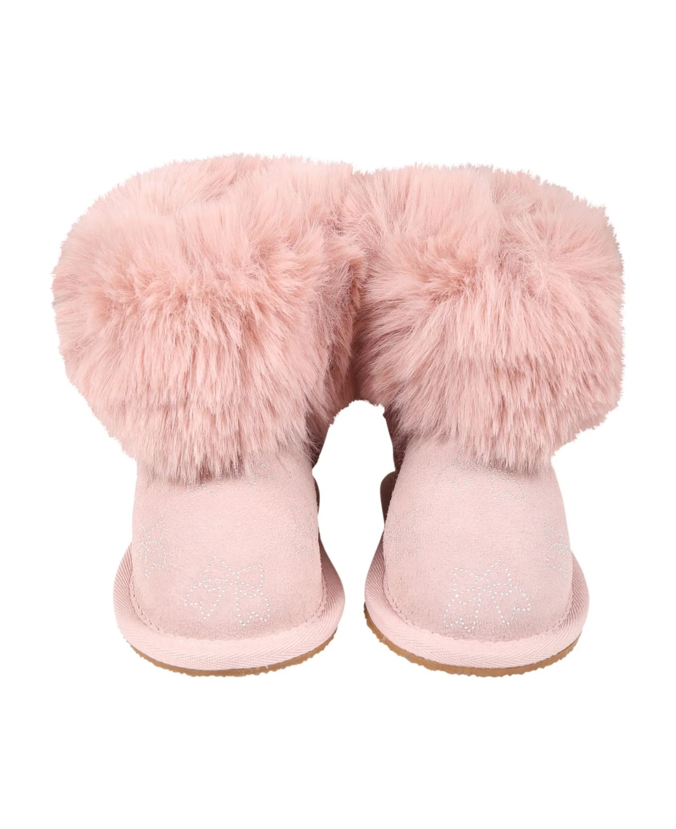 Pink suede boots, with rubber sole, faux fur detail. They are embellished with all-over bows and studs and with a heart-shaped logo patch on the side.