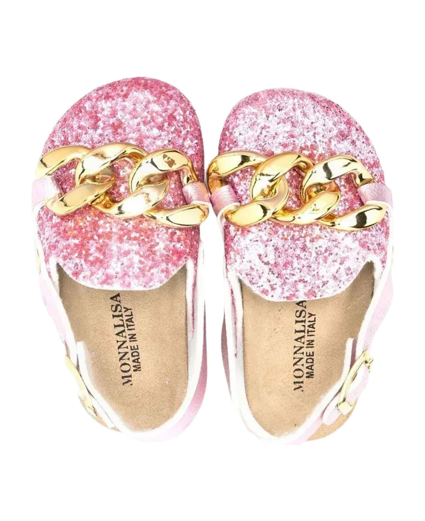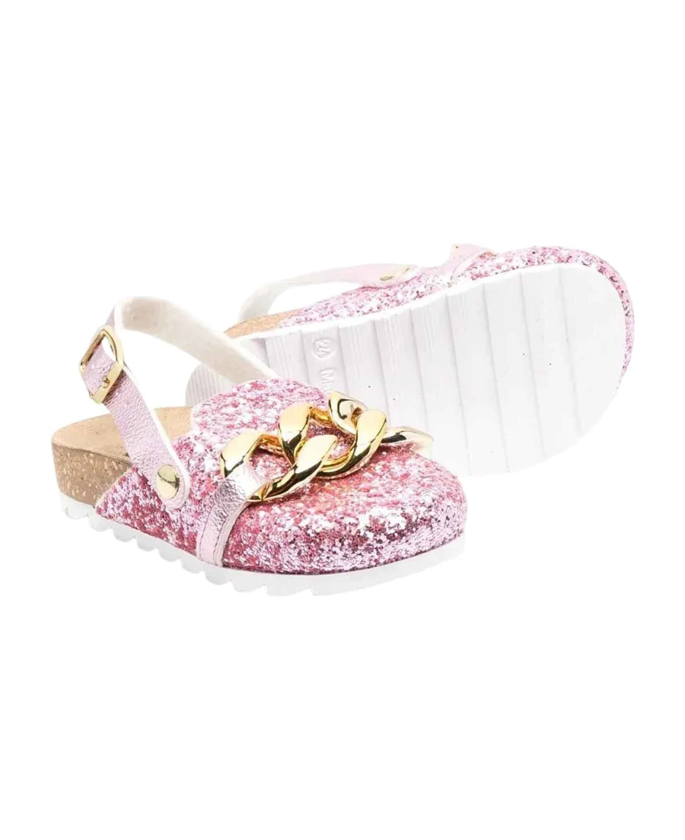 pink mules girl. Metallic finish, chain detail, slip-on design, round toe, side buckle closure and flat rubber sole. Polyurethane 40%, Cotton 30%, Acrylic 30%