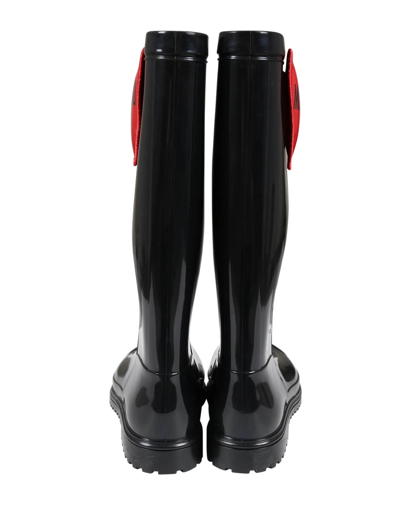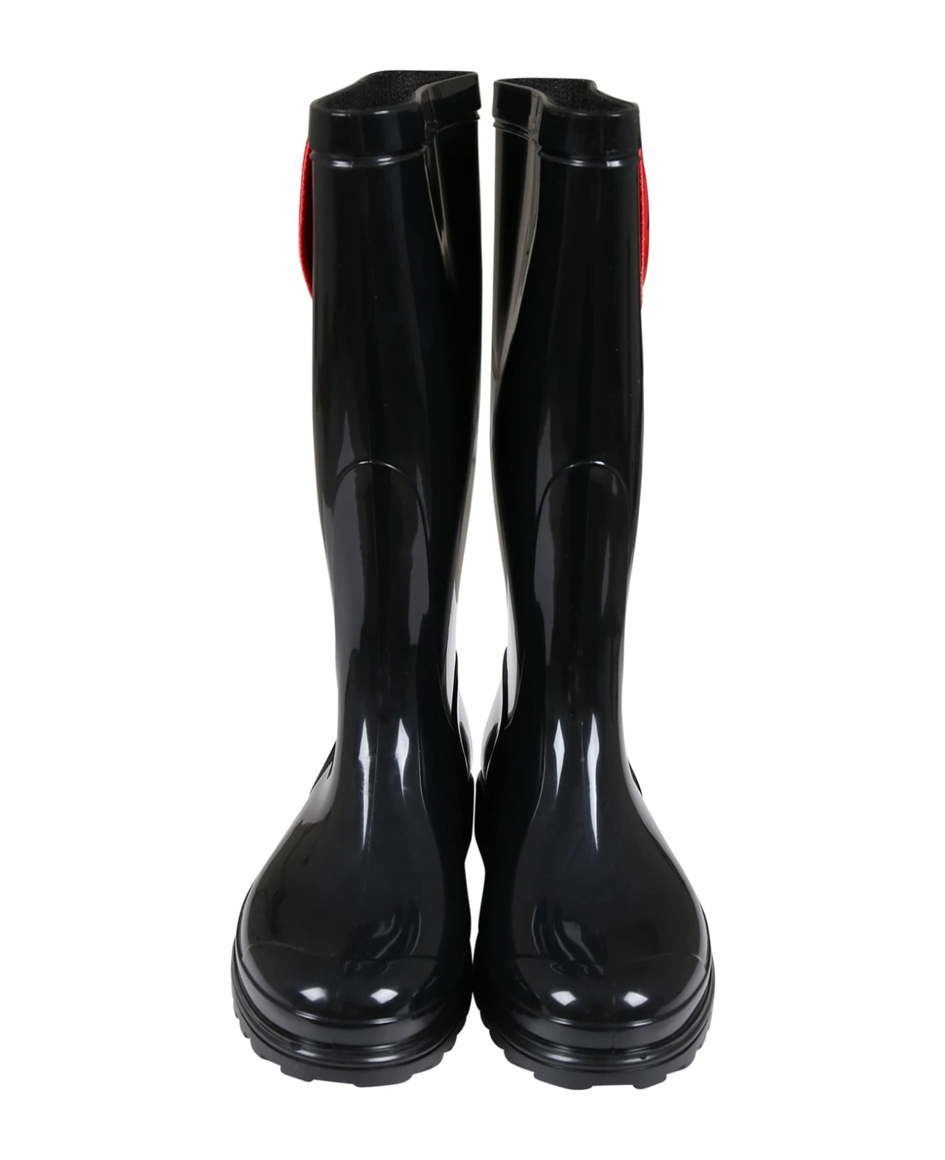 Black rain boots, with rubber sole. They are embellished with heart shaped patch and logo, on the side.