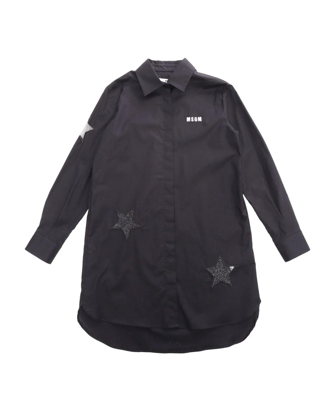 Stretch poplin dress, long sleeves, buttoned cuffs, stars appliques, logo, classic collar
