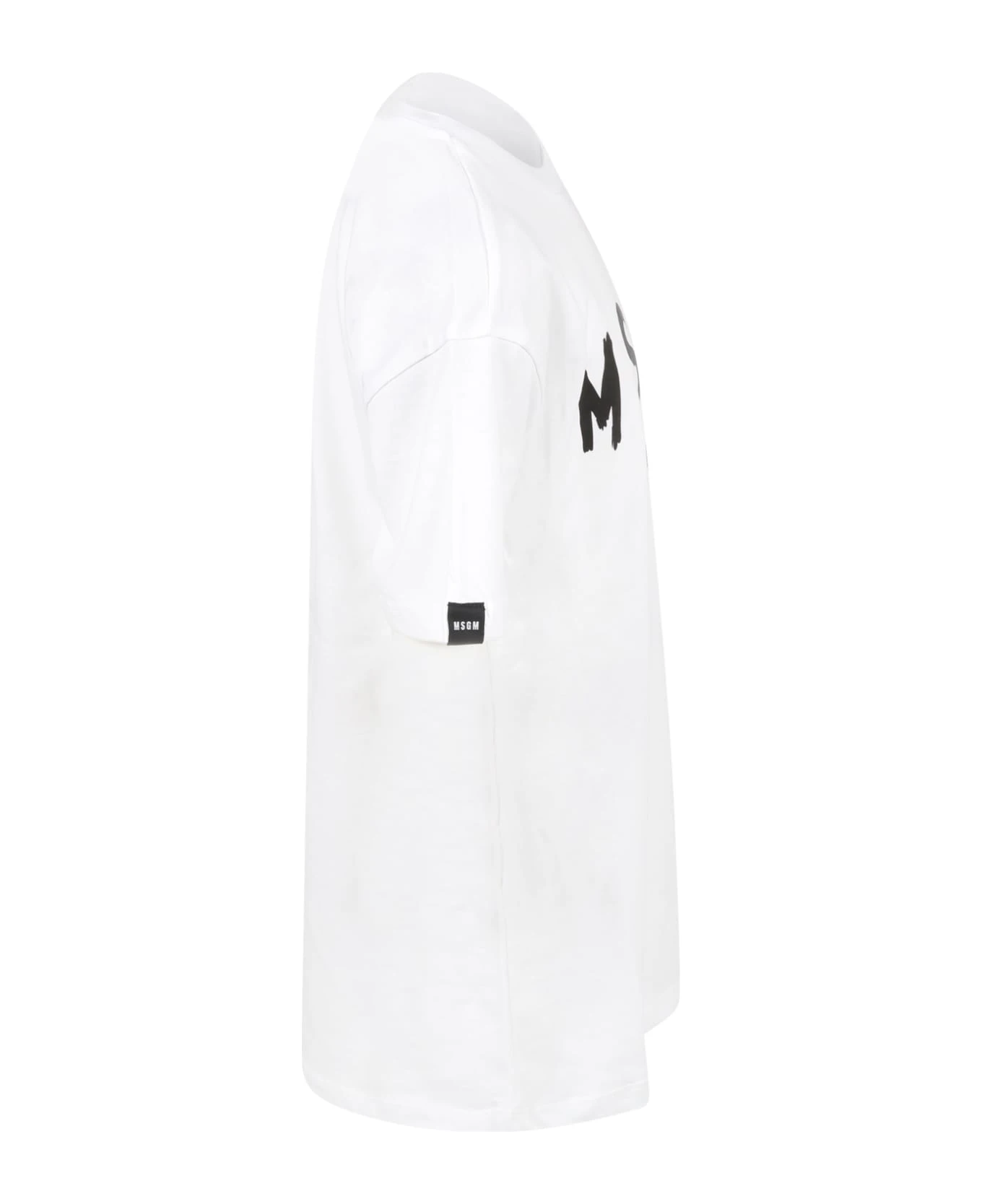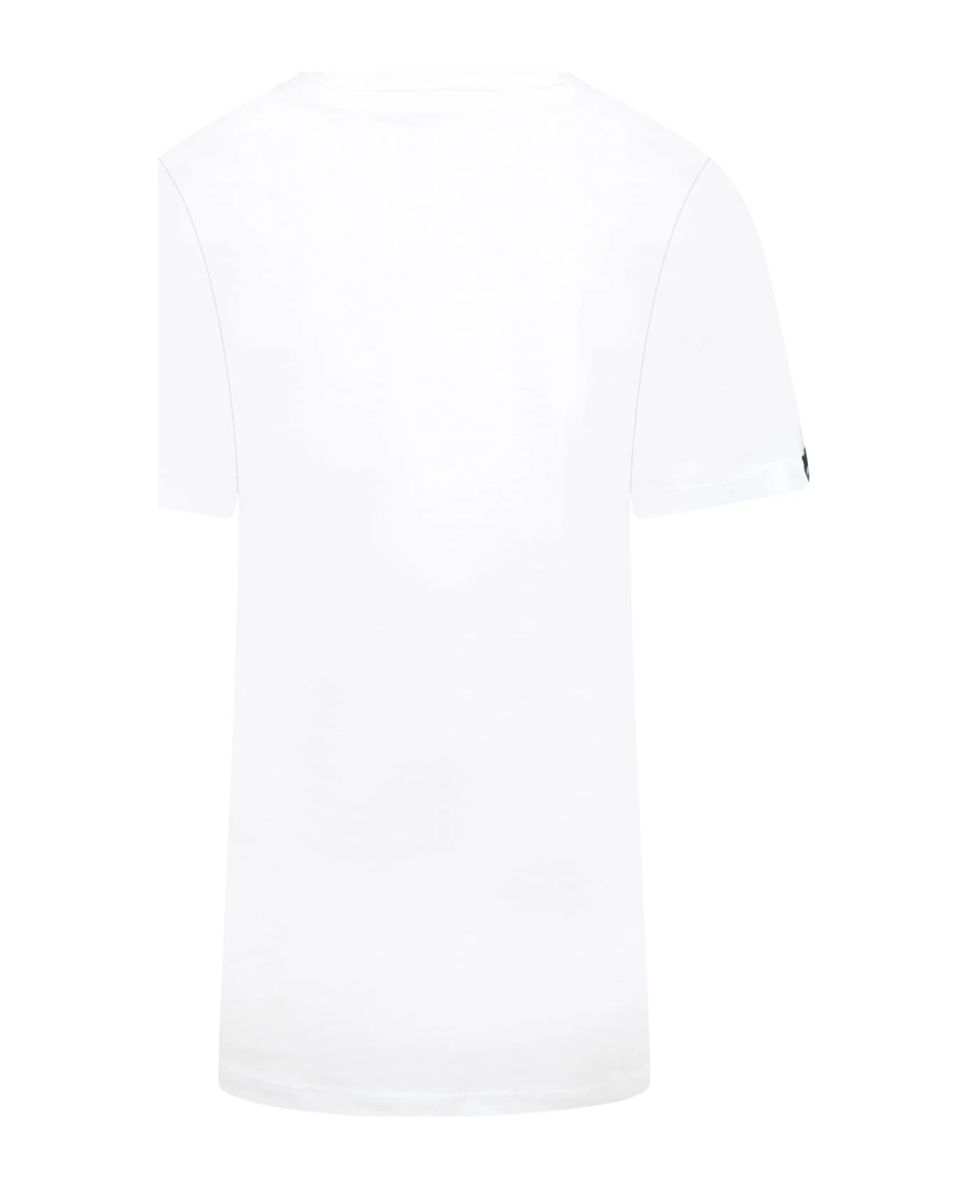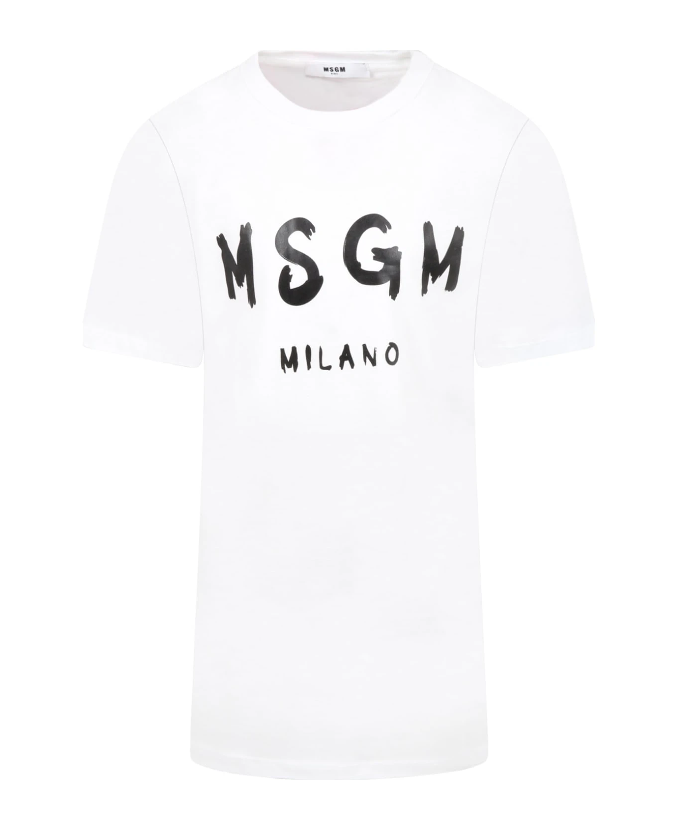White cotton dress, with short sleeves and ribbed crew neck. It is embellished with black iconic logo, on the front.