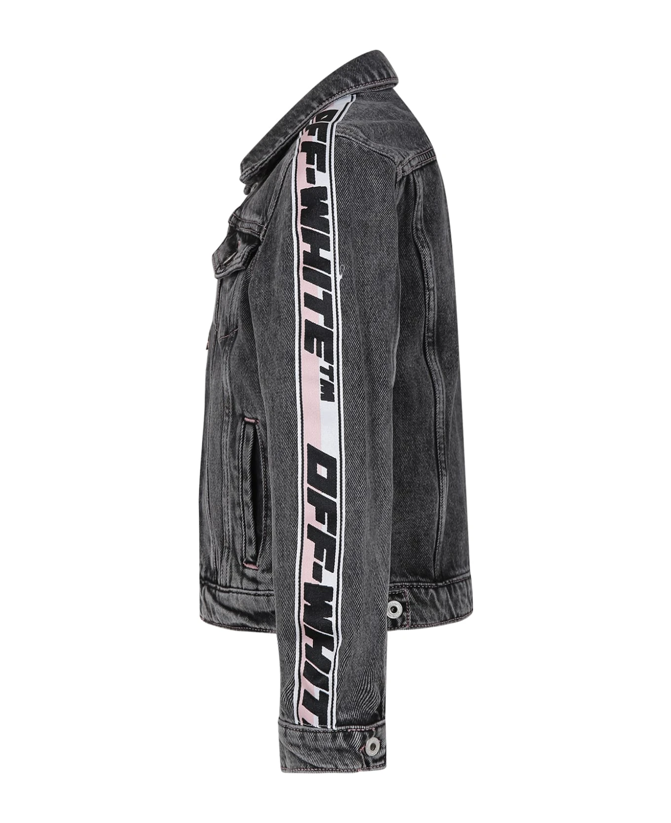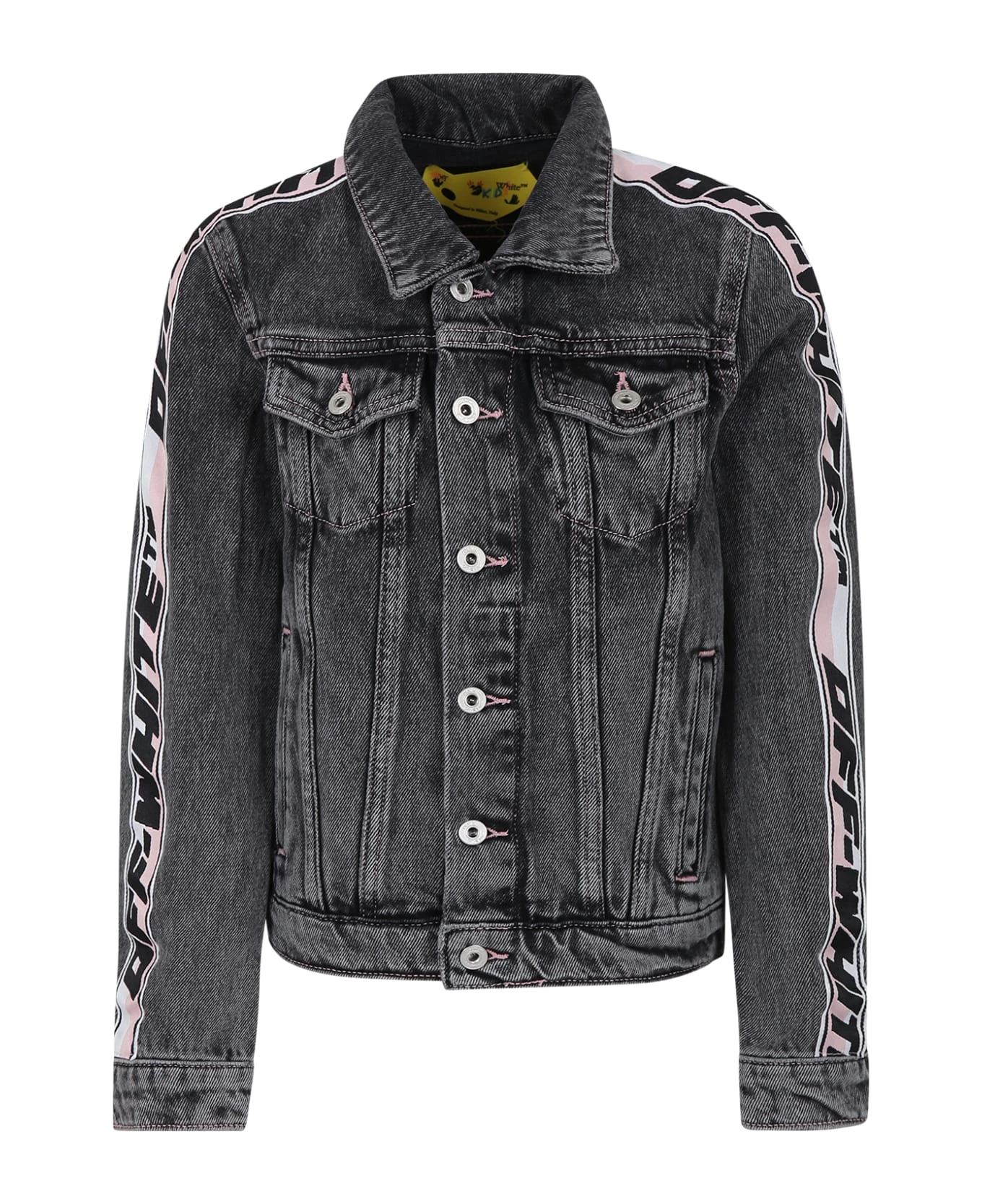 Black denim jacket, long sleeves, collar, front closure with buttons, side pockets and pockets with flap and button on the chest. It is embellished with patch logo on the back and multicolor logo on the shoulder and on the sleeves.