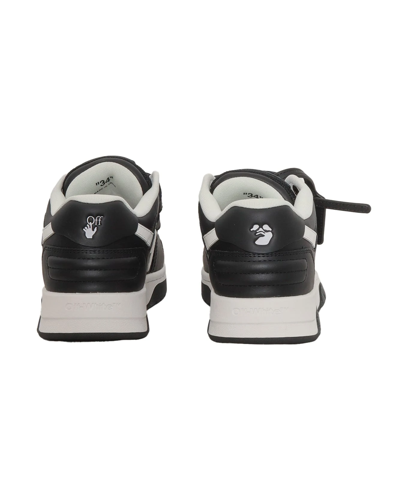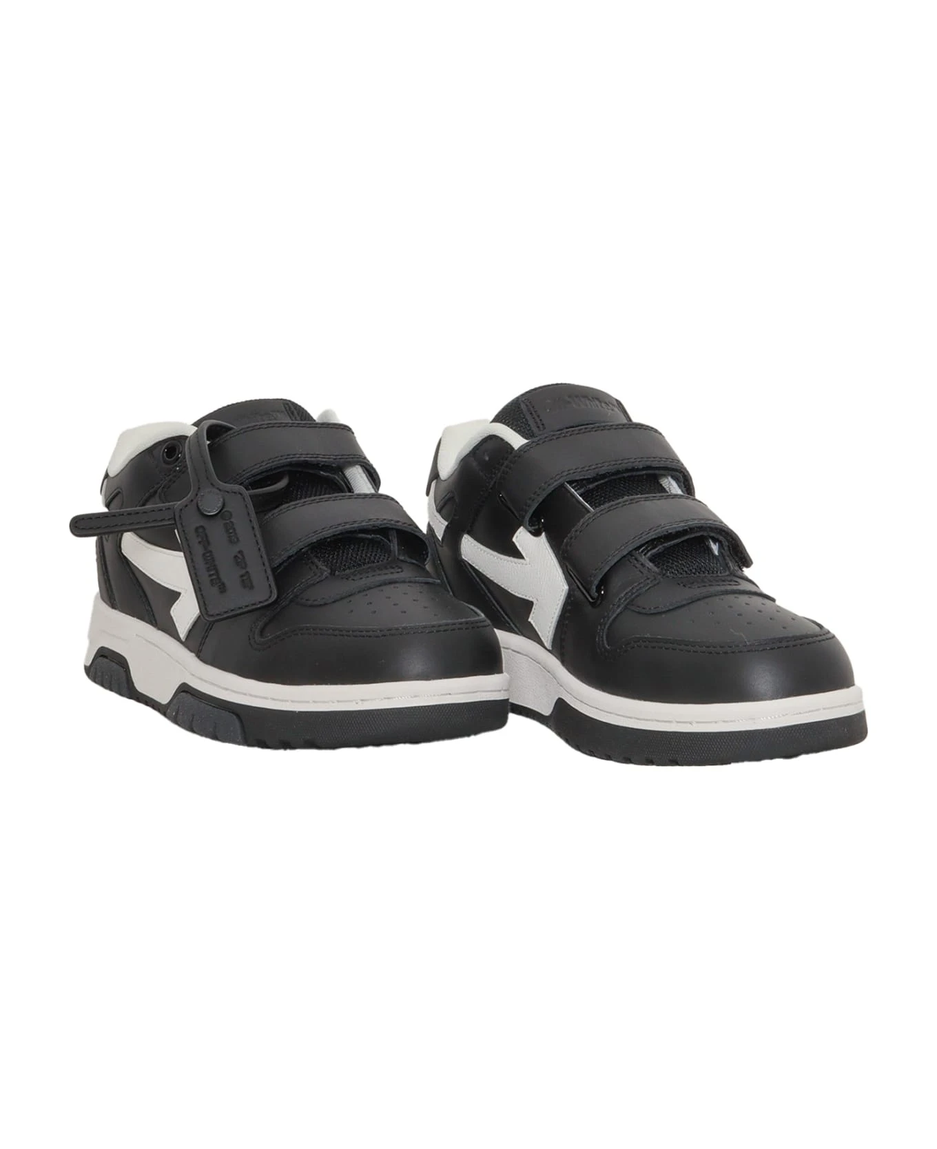 Leather sneakers, contrasting details, strap fastening, badge holder detail with lettering, rubber sole