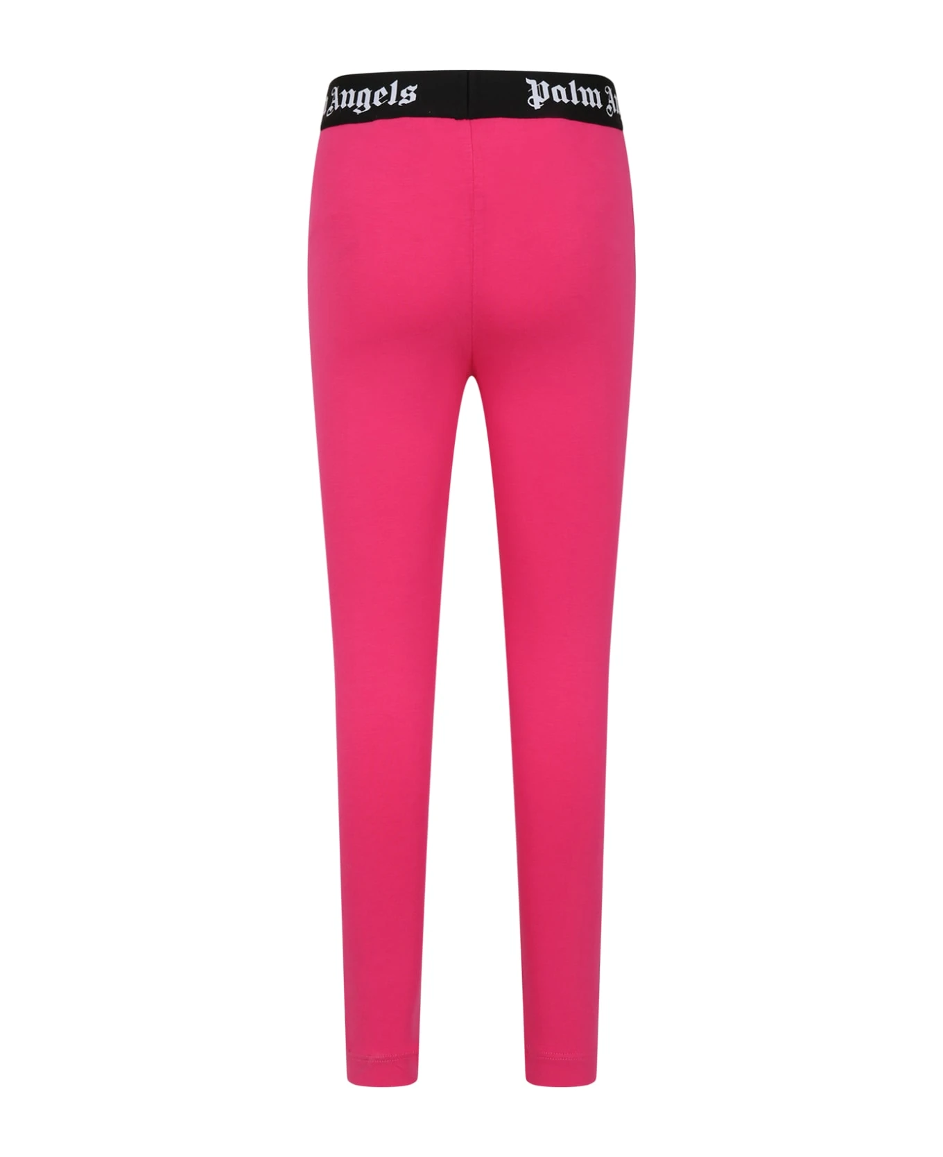 Fuchsia leggings in cotton blend, with black elastic waistband. They are embellished with white all-over logos on the elastic.